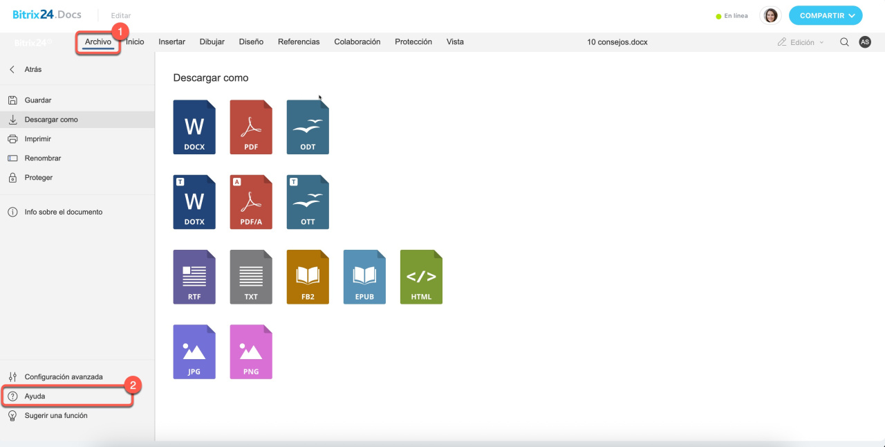 Para conocer las funciones del editor de Bitrix24, haz clic en Archivo > Ayuda.