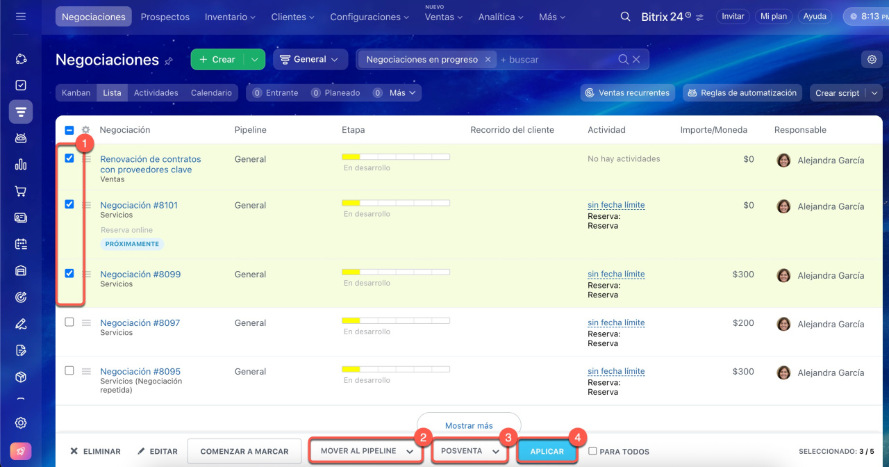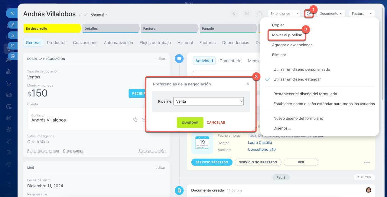 Recuerda que cuando mueves negociaciones a otro pipeline, se resetearán las etapas de negociaciones, así como todo el historial de sus cambios en el pipeline anterior.
