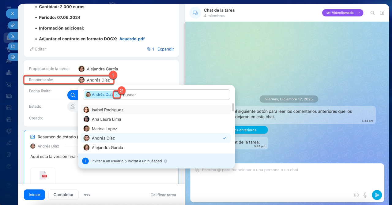 - Puedes cambiar la persona responsable en la ficha de la tarea o en la lista de tareas.