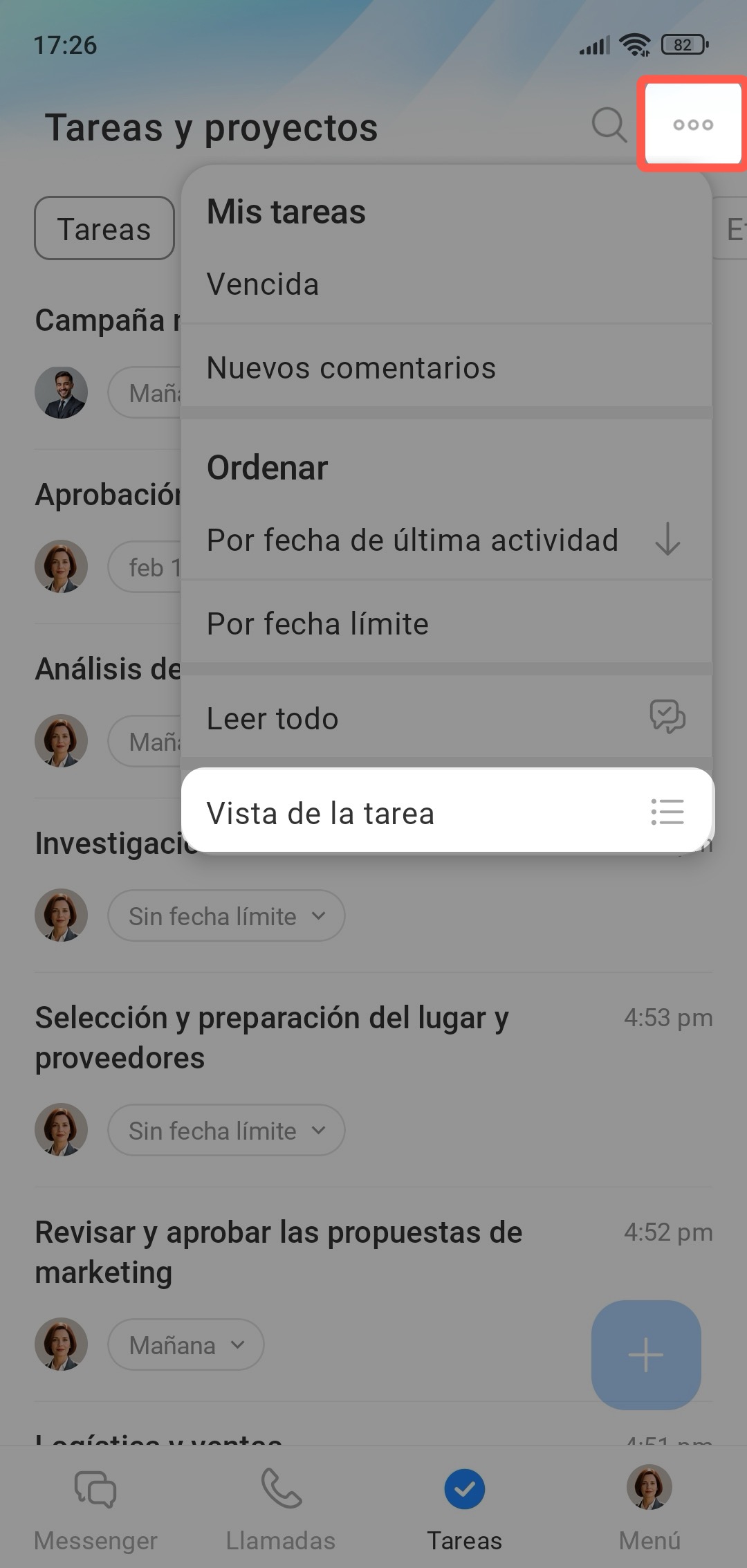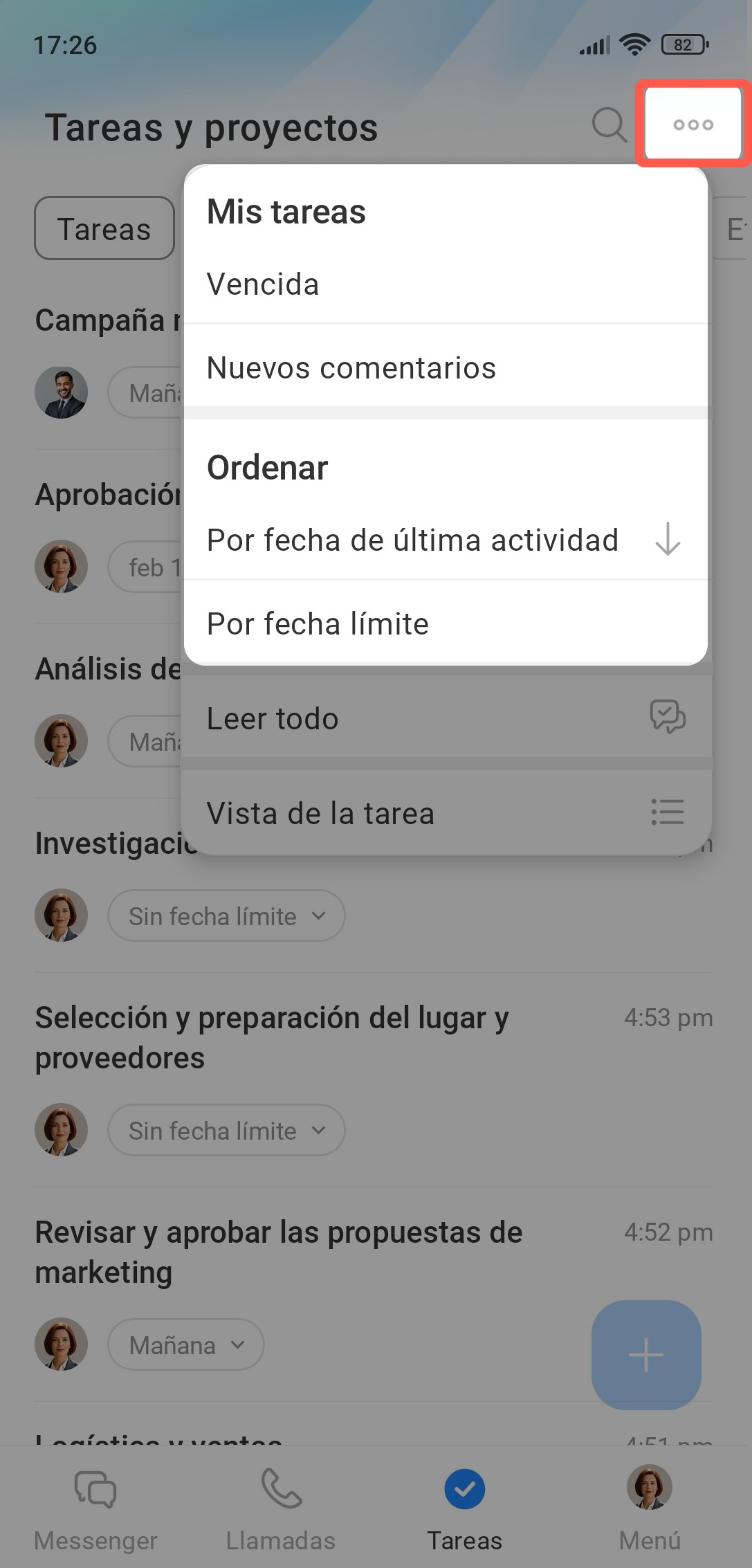 Ordena las tareas por actividad, fecha de vencimiento o nuevos comentarios.