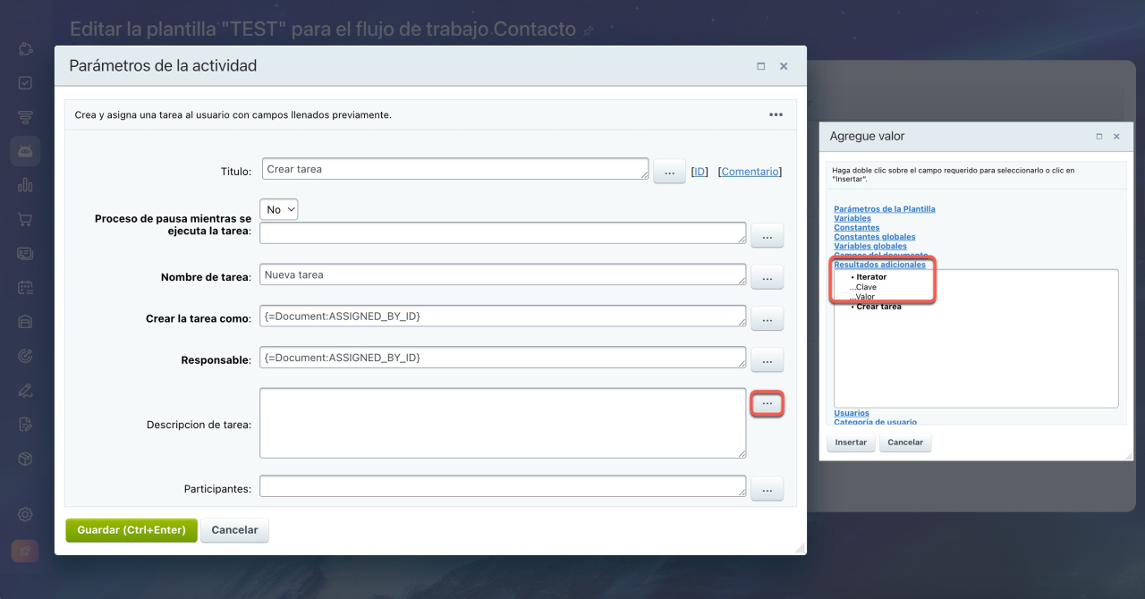 Por ejemplo, si tienes una variable del tipo Enlace al empleado que contiene una lista de usuarios de la cuenta, y necesitas crear una tarea para cada uno de estos usuarios de forma secuencial, selecciona la variable en los parámetros del iterador y agrega la acción Crear tarea a la construcción.