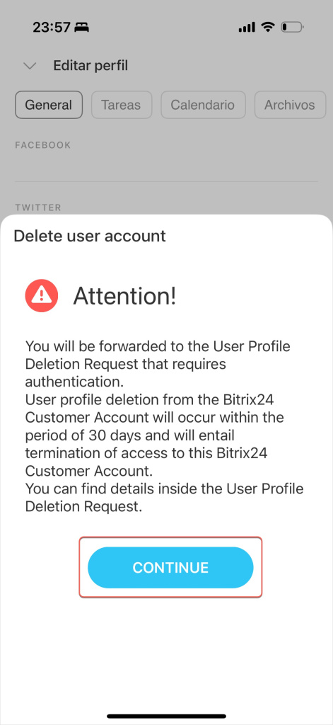 Desplázate hacia abajo y toca Eliminar la cuenta (Delete profile). Lea las instrucciones y toca Continuar (Continue). Se abrirá automáticamente una ventana de autorización en el navegador de tu móvil.