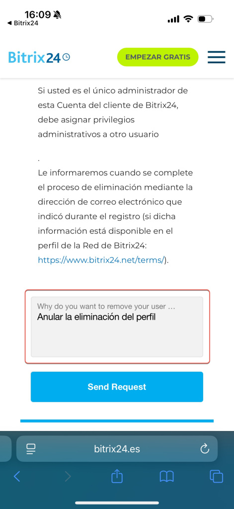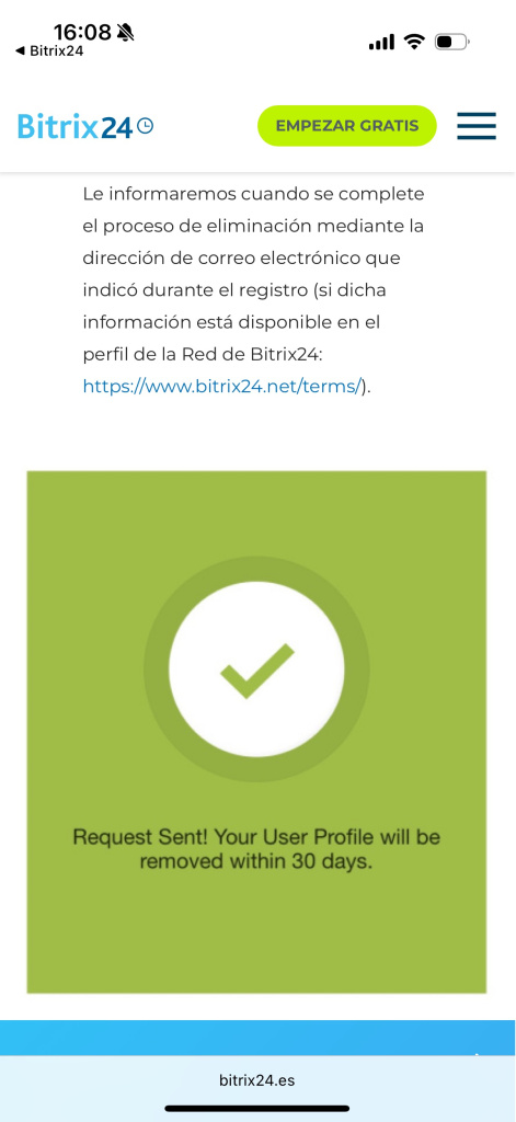 Los empleados de Bitrix24 revisarán la solicitud y eliminarán el perfil dentro de 30 días. Si eres el único administrador, tu cuenta de Bitrix24 se eliminará junto con tu perfil, es decir, se cerrará el acceso a todos los empleados.