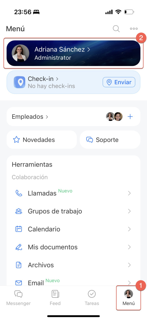 Inicia sesión en la aplicación móvil. Abre la aplicación móvil de Bitrix24 e inicia sesión en la cuenta que deseas eliminar. Toca Menú en la esquina inferior derecha y ve a tu perfil personal.