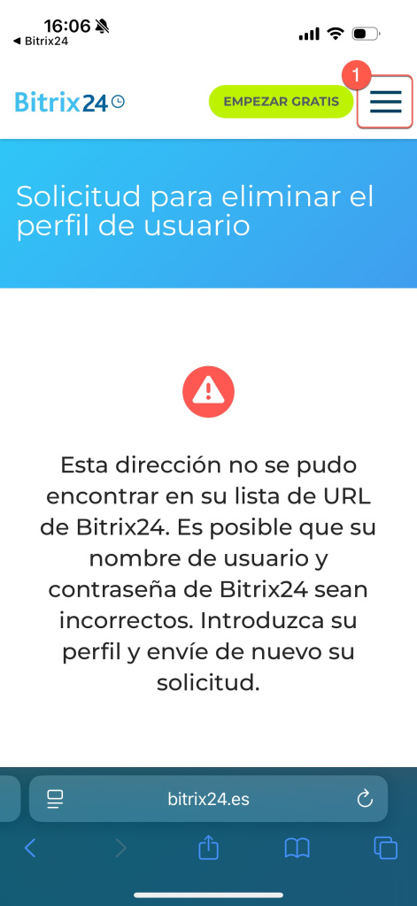 Si es necesario, borra el historial de tu navegador durante el período en el que iniciaste sesión en Bitrix24. Vuelve a ingresar los detalles correctos de la cuenta que deseas eliminar.