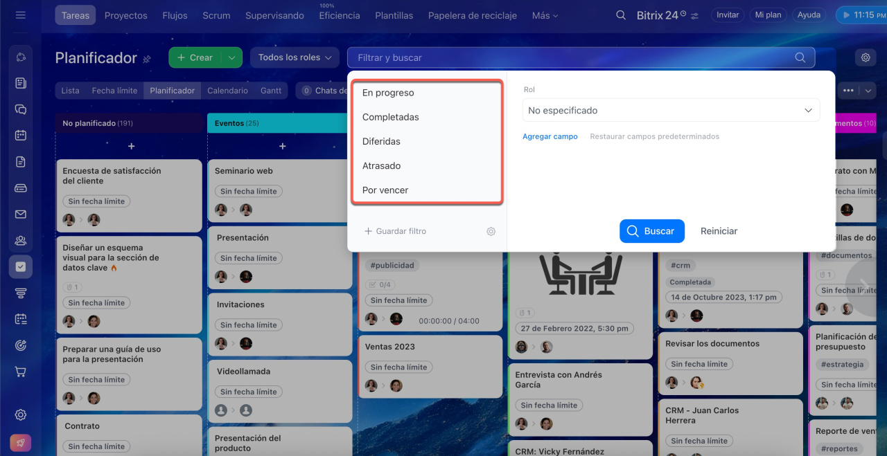 - En Bitrix24, puedes buscar tareas y elementos de CRM utilizando palabras y frases clave. Esta funcionalidad está sujeta a ciertos límites que dependen del plan contratado.