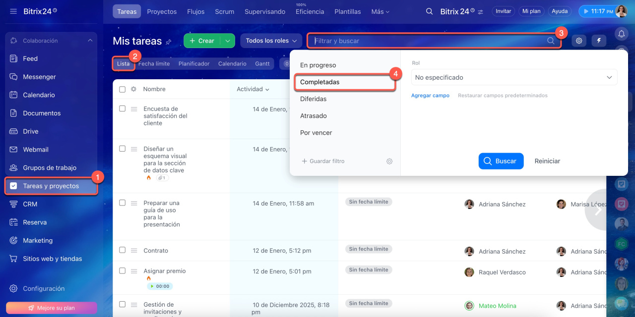 3-4. Haz clic en la barra de búsqueda y aplica el filtro Completadas.