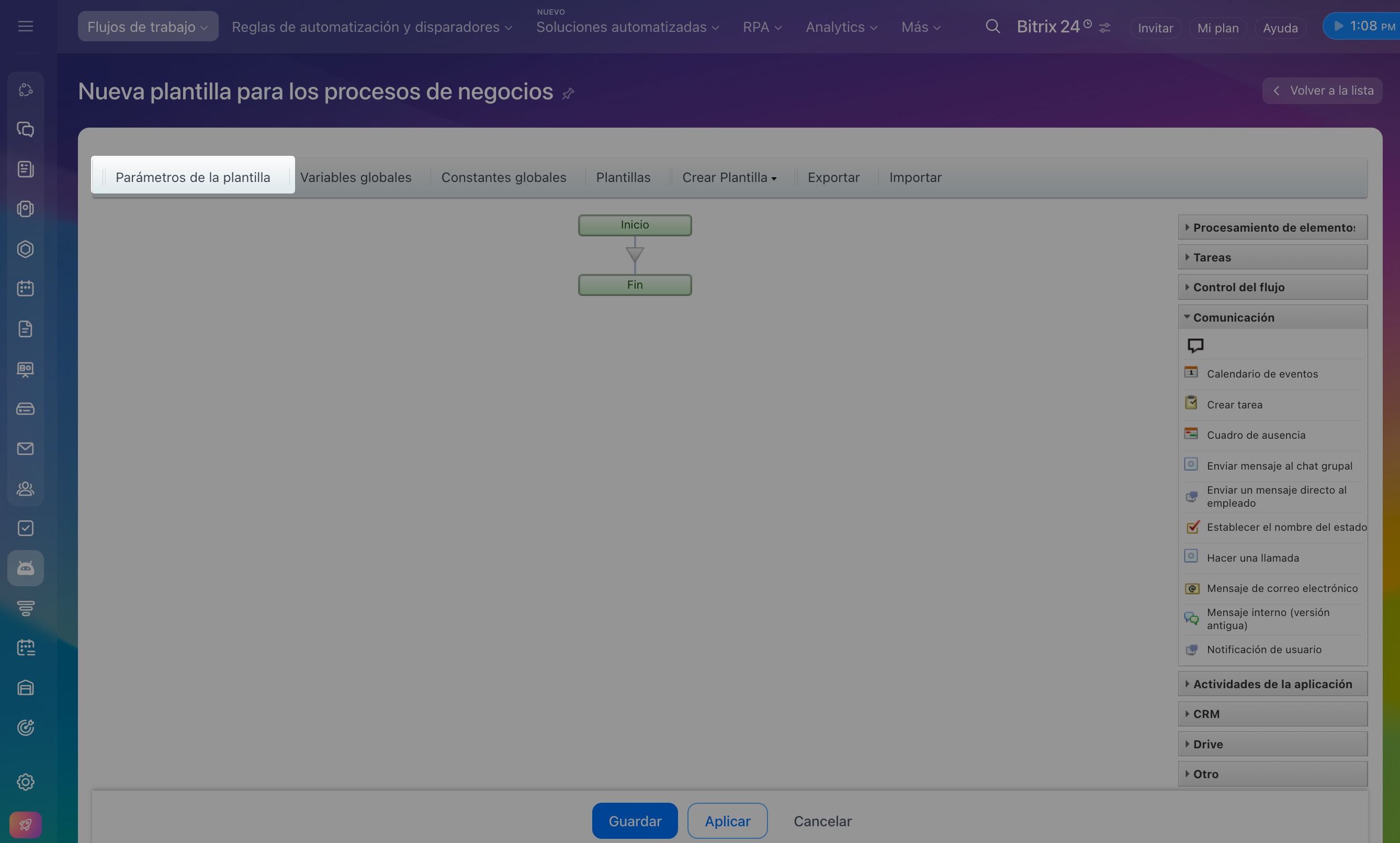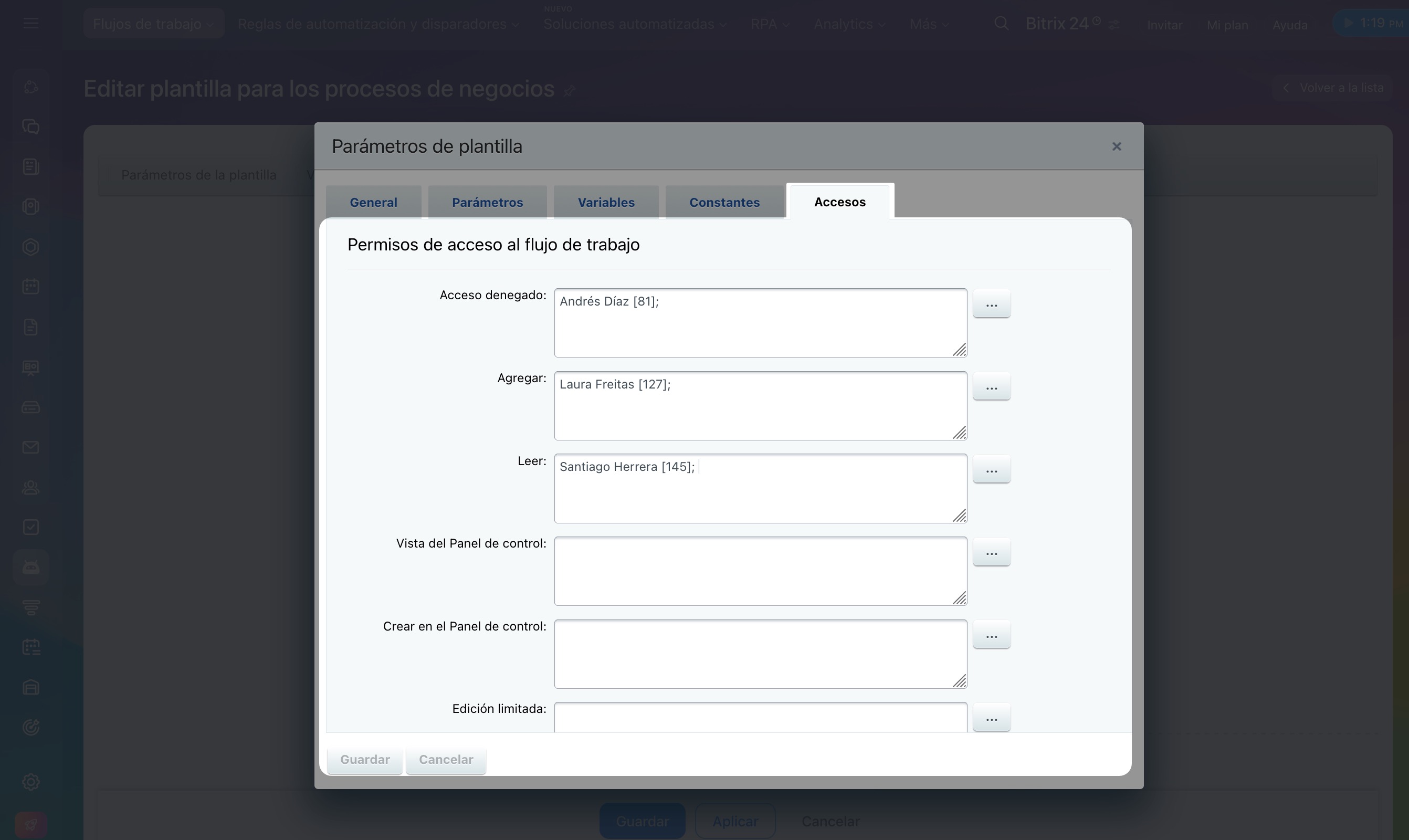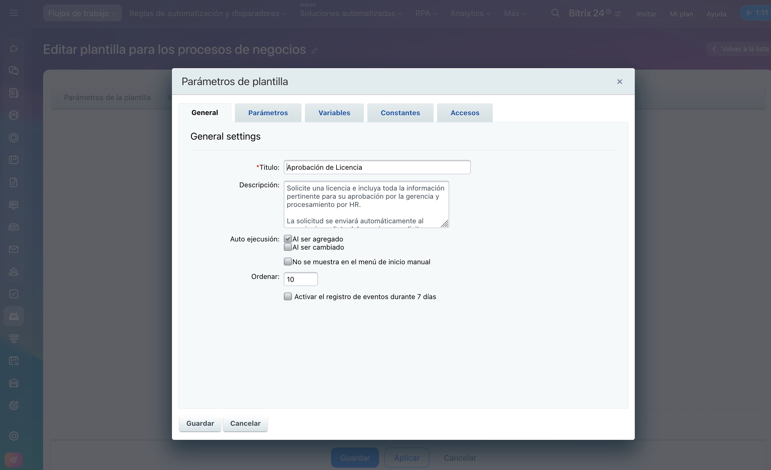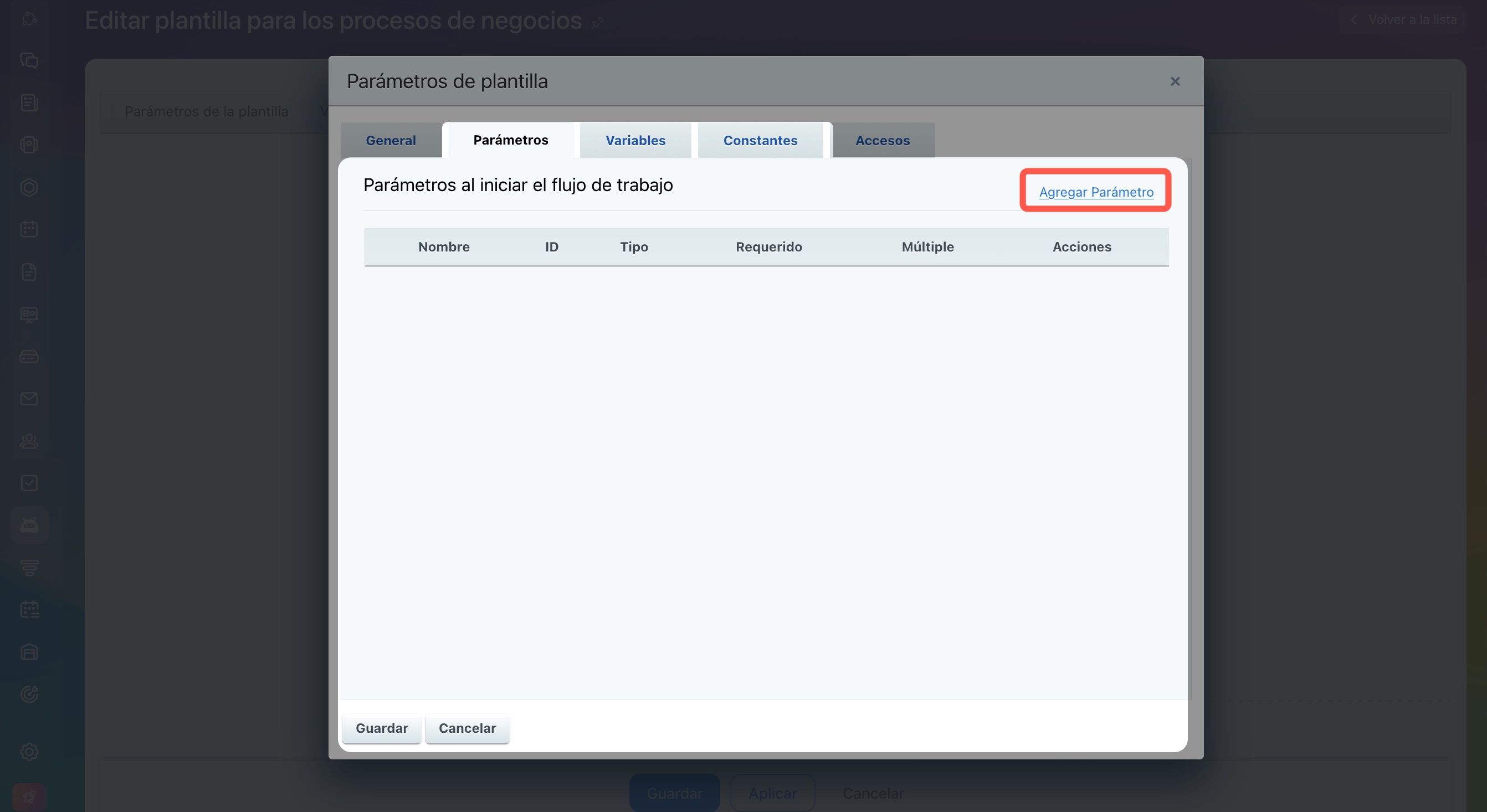 - Abre una plantilla existente o crea una nueva. Haz clic en Parámetros de la plantilla. Completa las pestañas de Parámetros, Variables y Constantes y configura los permisos de acceso para la plantilla.