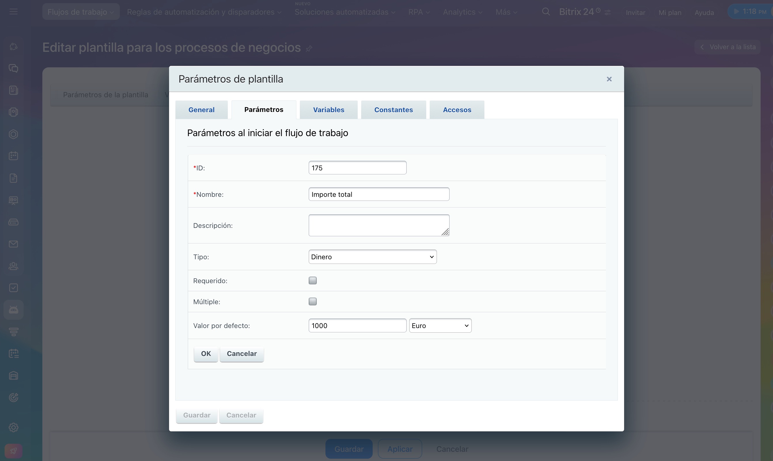 - Tipo: selecciona el tipo de valor necesario de la lista. Esto asegura la correcta ejecución del flujo de trabajo al almacenar y procesar datos. Dependiendo del tipo, puedes establecer parámetros adicionales. Por ejemplo, especifica la moneda para el tipo Dinero.