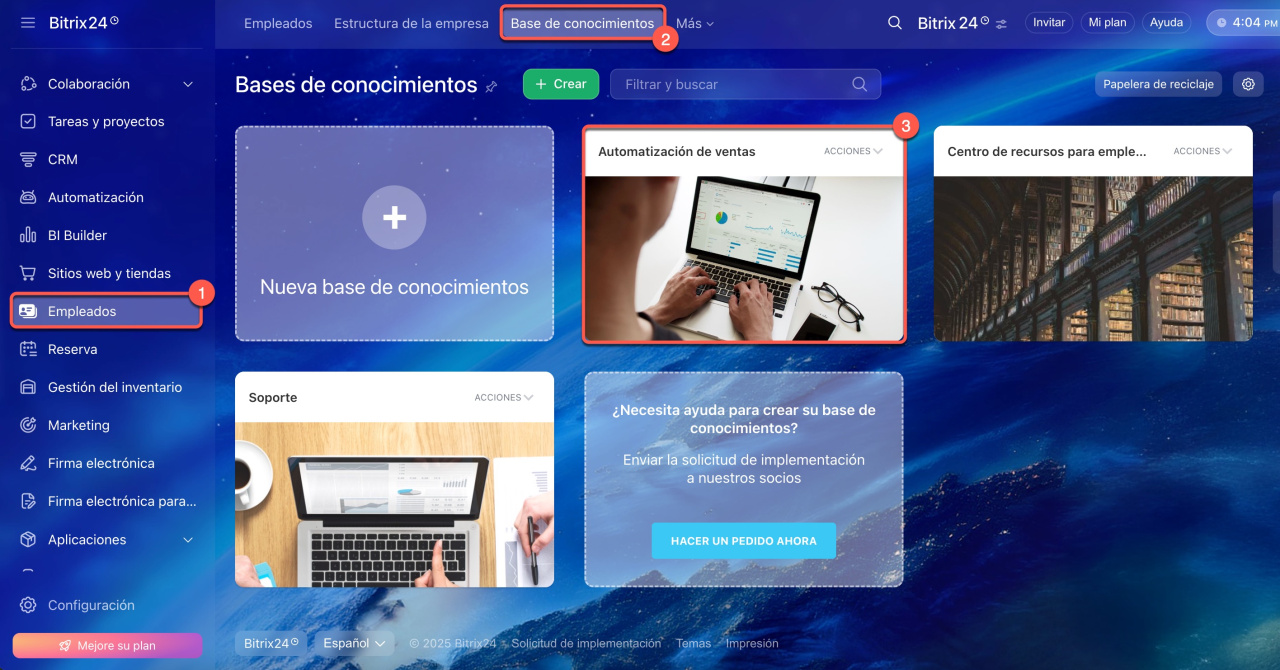 1-3. Accede a Empleados > Base de conocimientos y abre la base de conocimientos a la que quieres agregar el archivo.