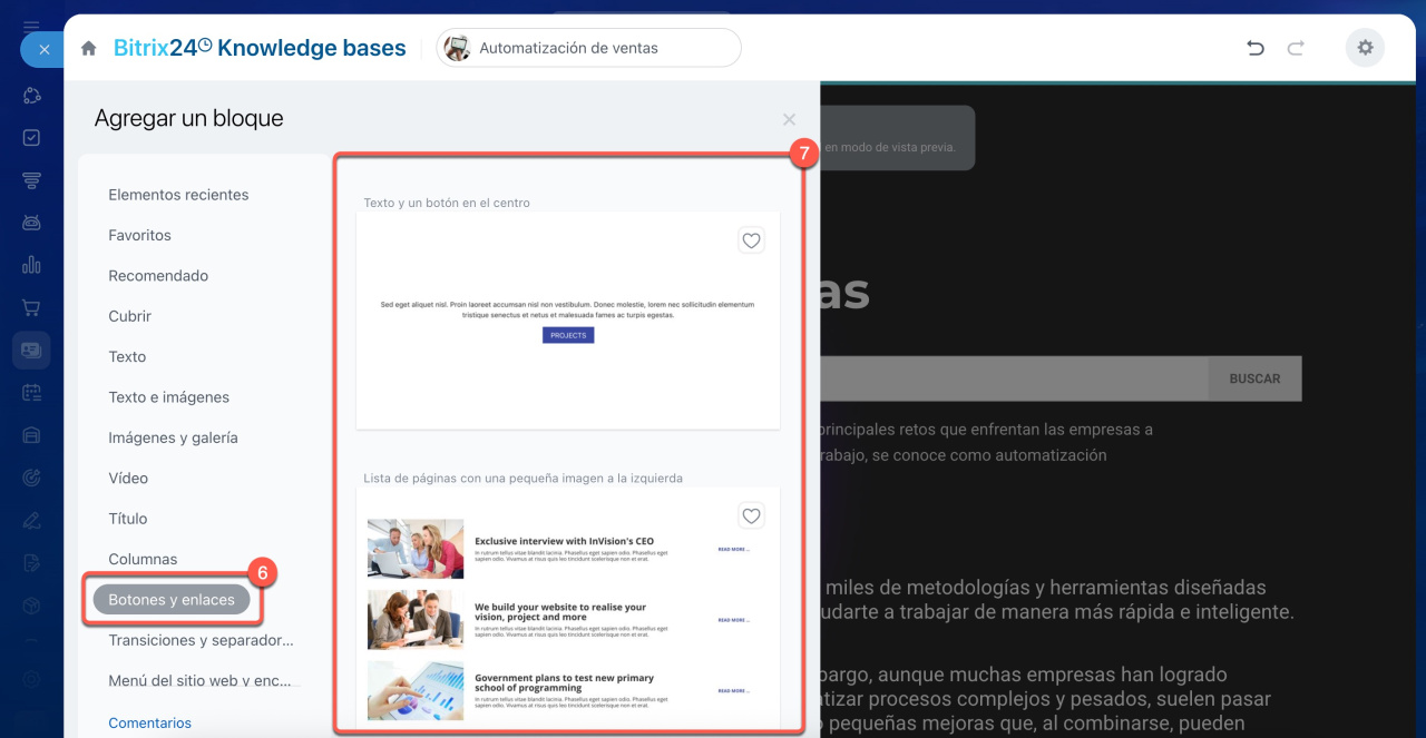 6-7. Abre la sección Botones y enlaces y selecciona el bloque adecuado.