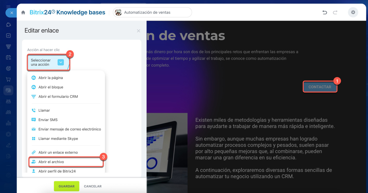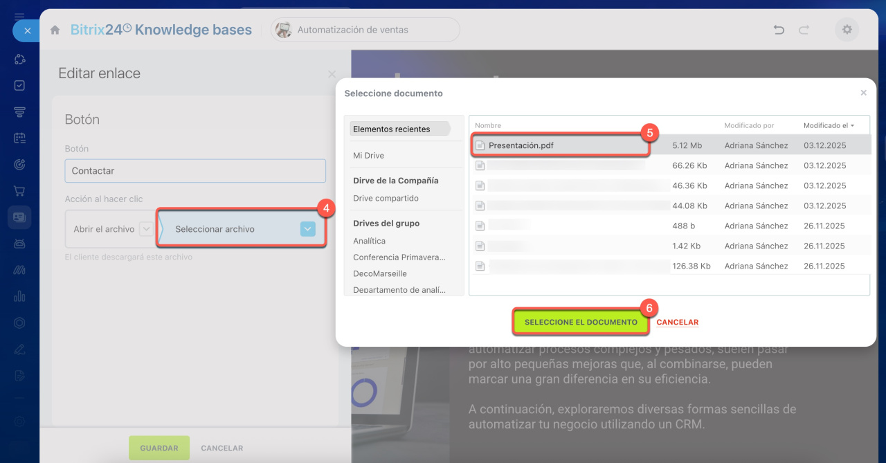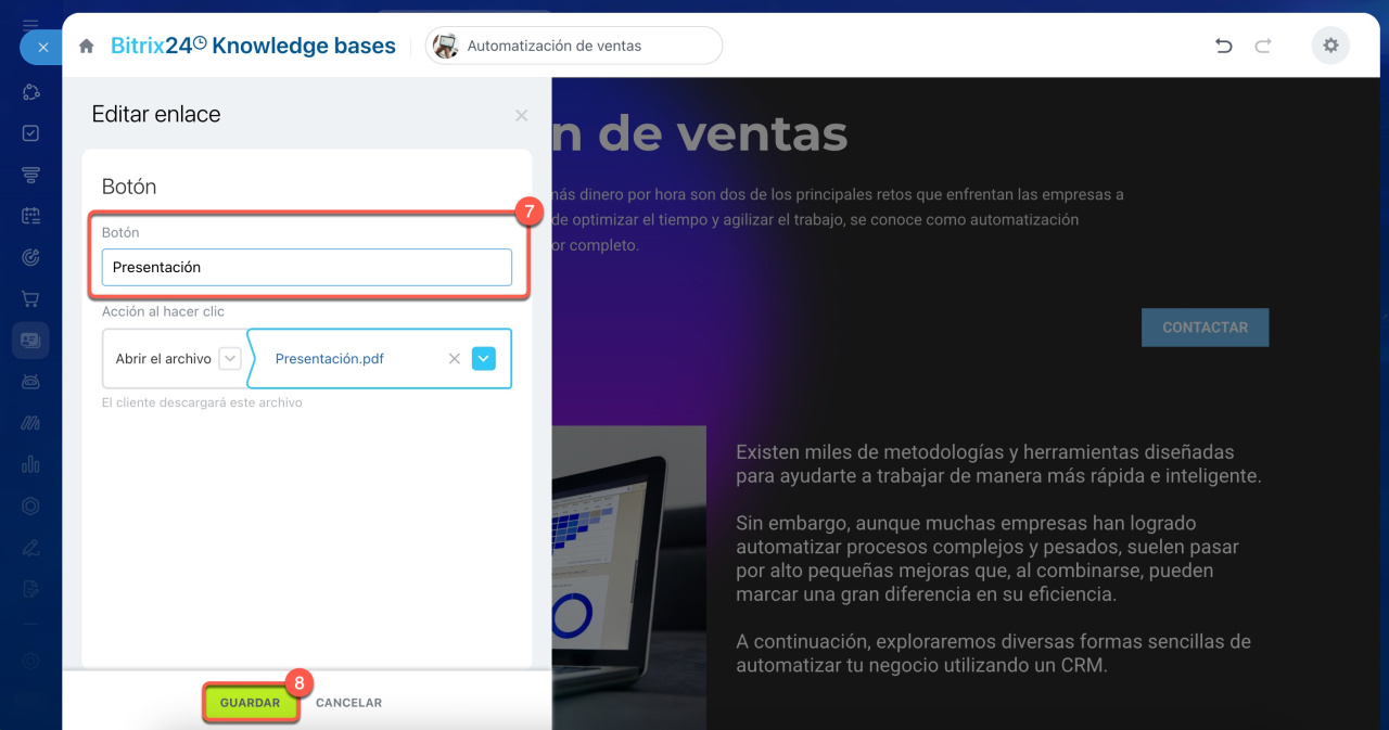 - Para hacerlo, abre la página de la base de conocimientos, selecciona y añade un botón, y sube el archivo. Cuando un colega haga clic en el botón, el archivo se abrirá.