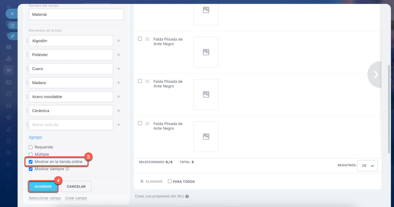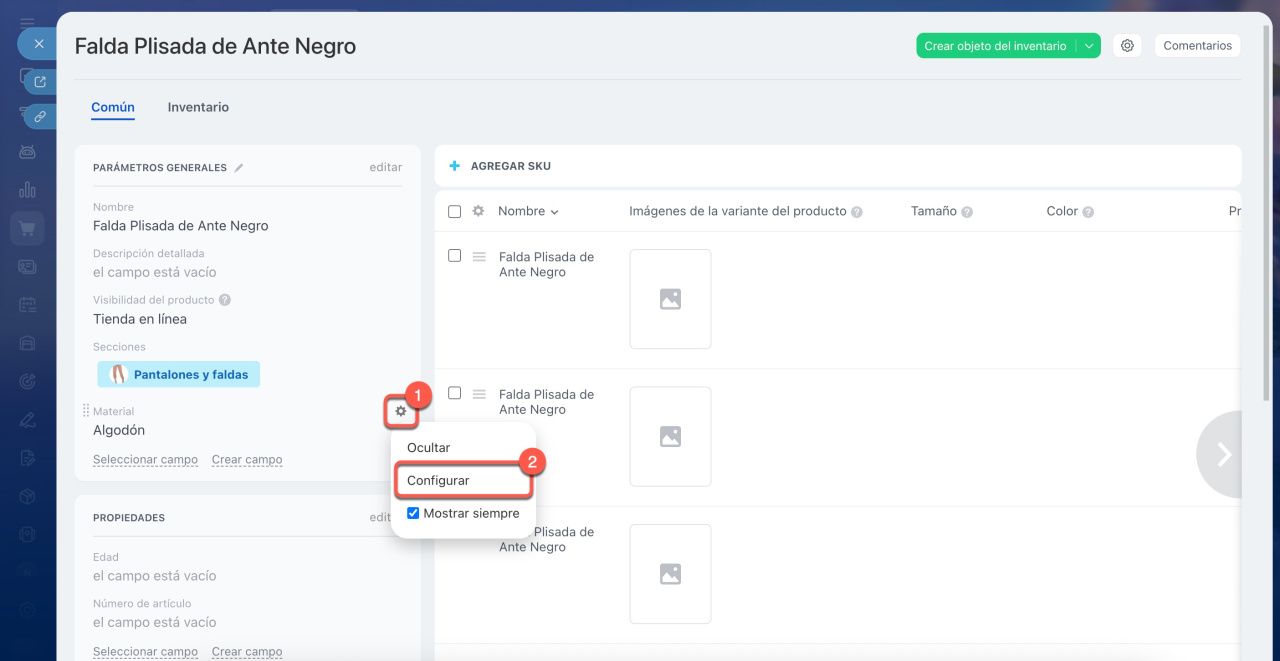 Localiza el producto en el catálogo y haz clic en Configuración (⚙️) > Configurar junto al campo que quieres mostrar en tu tienda online. Habilita la opción Mostrar en la tienda online y guarda los cambios.