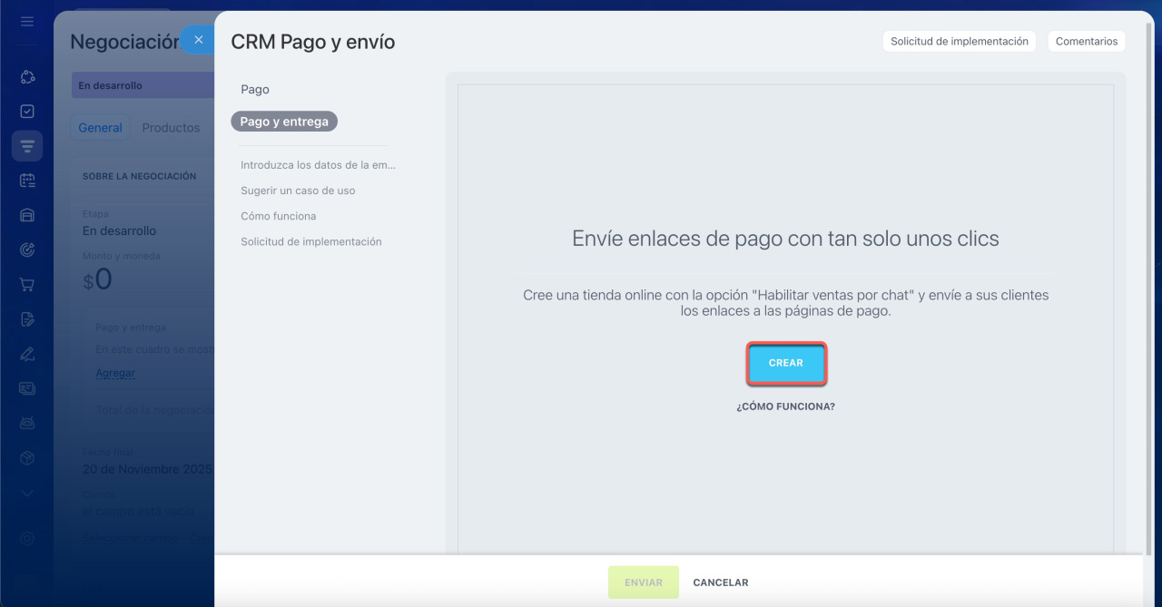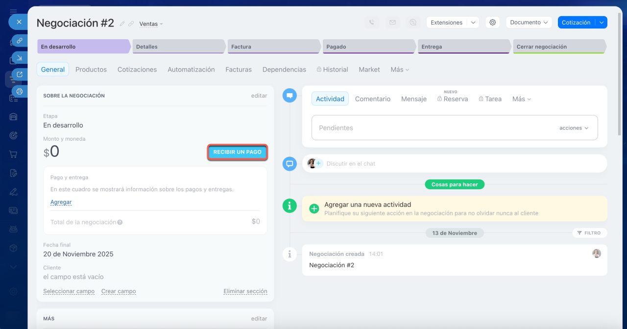 Ve a la ficha de negociación en CRM y haz clic en el botón Recibir un pago.