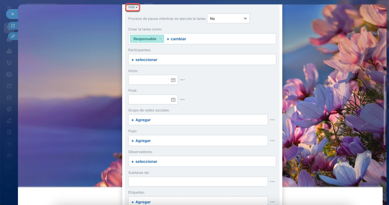 Más. Especifica parámetros adicionales de la tarea: agrega participantes, habilita el seguimiento del tiempo, vincula la tarea a un flujo, etc.