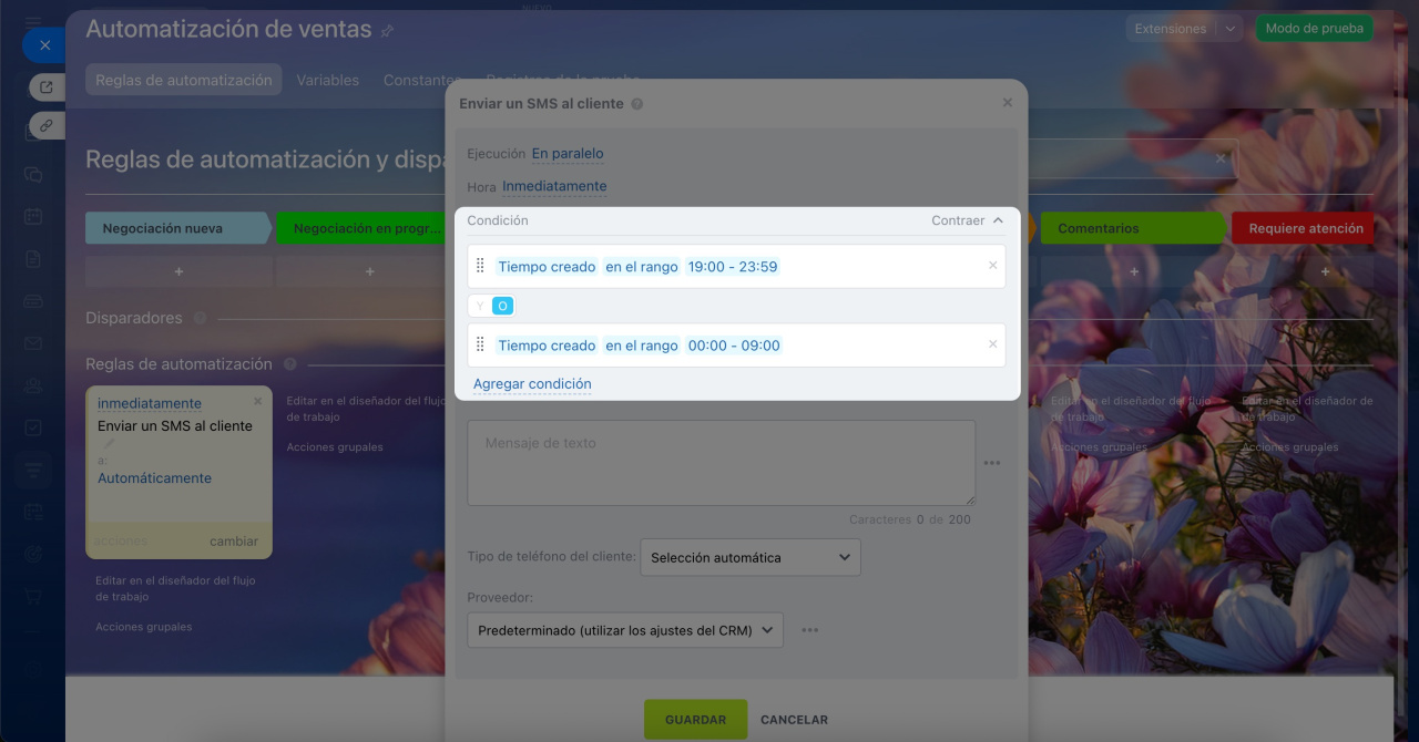 Solución. Define rangos de tiempo dentro del mismo día. Para activar la regla de automatización para negociaciones creadas entre las 19:00 y las 9:00 del día siguiente, establece dos condiciones: en el rango 19:00 - 23:59