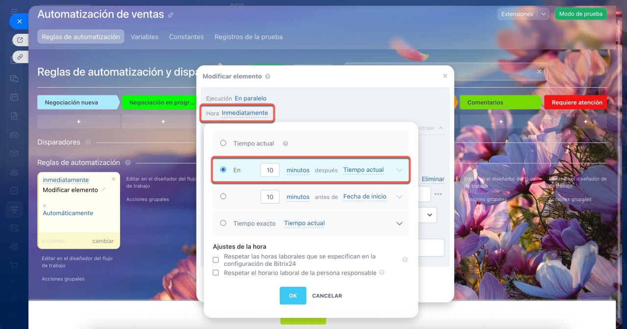 Solución. En la configuración de la regla de automatización, retrasa la ejecución por 10 minutos. Esto permite que el webhook complete todos los campos, asegurando que la regla pueda ejecutarse con la condición especificada.