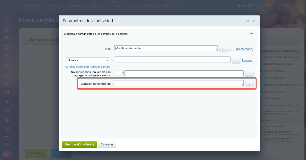 Razón. El filtro de seguridad de Bitrix24 bloquea componentes del proceso cuando las acciones o variables contienen caracteres especiales como >, <, =, +, @ o #. Este bloqueo puede no ser inmediato, manifestándose posteriormente.