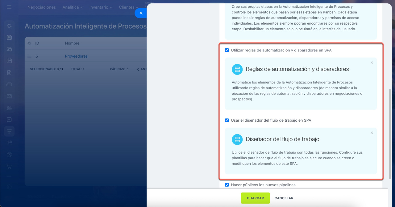 Activa las reglas de automatización, disparadores y el diseñador de flujos de trabajo en la configuración de procesos inteligentes.