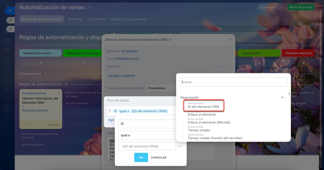 Configura un filtro de campo en la configuración de la regla de automatización Obtener información del elemento CRM. El valor del campo debe ser único. Se recomienda usar el campo ID como filtro, ya que este valor siempre es único.