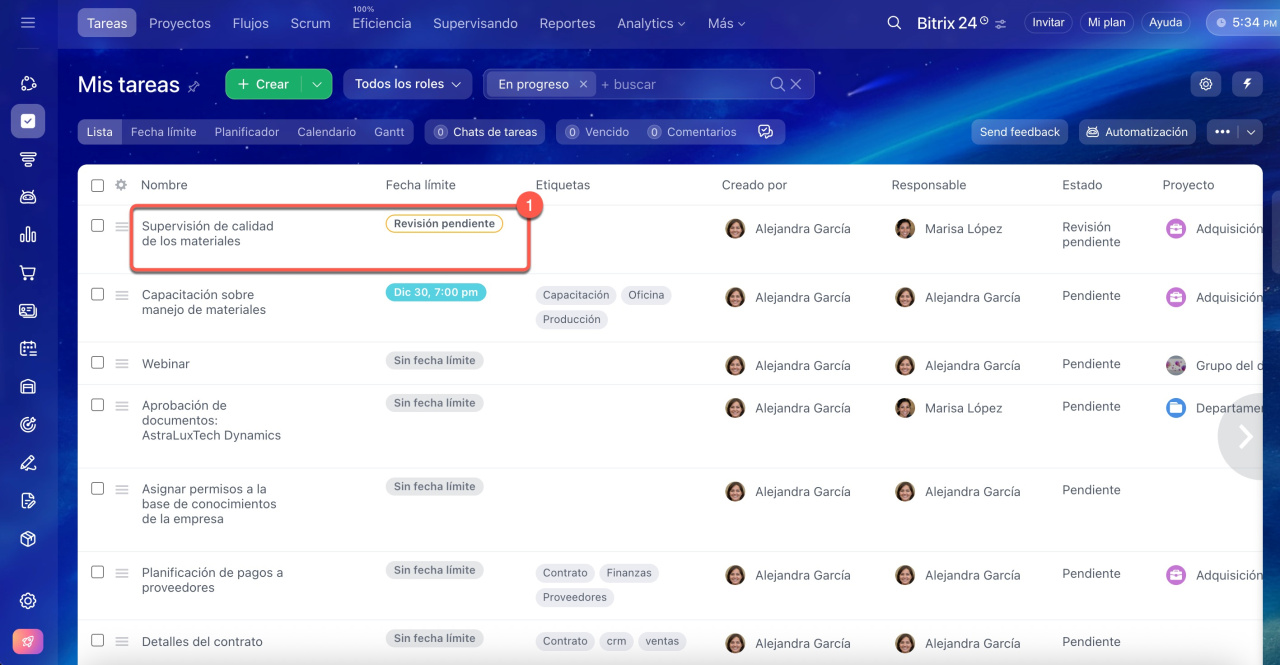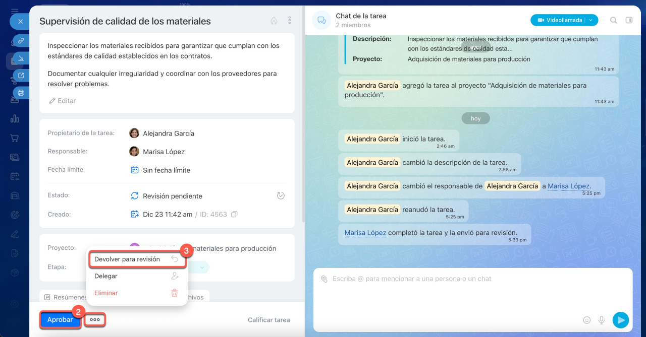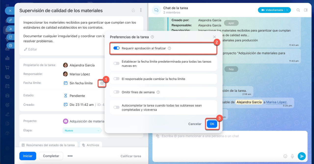 Las tareas de Bitrix24 incluyen la opción Requerir aprobación al finalizar, que sirve para supervisar el progreso de la tarea y garantizar que no se pierda ningún resultado importante. Una vez que el responsable complete la tarea, el creador podrá aceptarla o devolverla para su revisión.