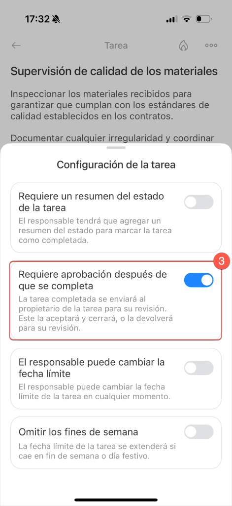 - La opción Requerir aprobación al finalizar sirve para supervisar el progreso de la tarea y asegurar que no se pierda ningún resultado importante.