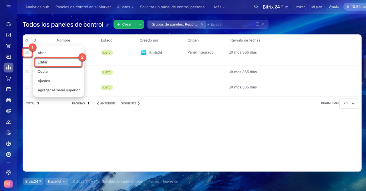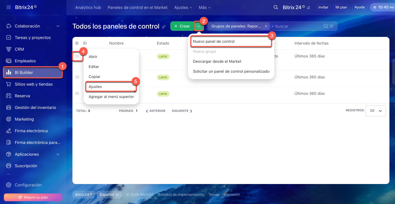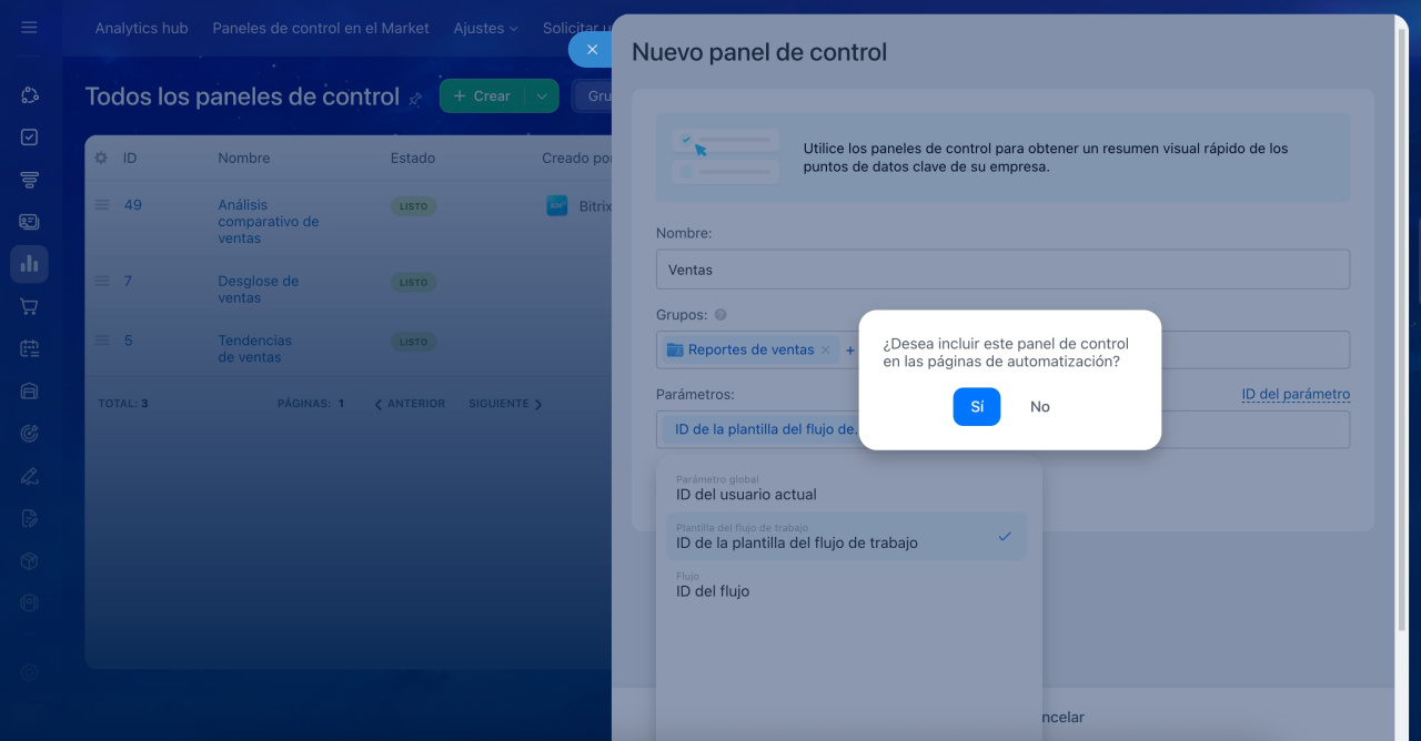 - Configura los parámetros y selecciona las áreas de Bitrix24 para los paneles de control nuevos y existentes.