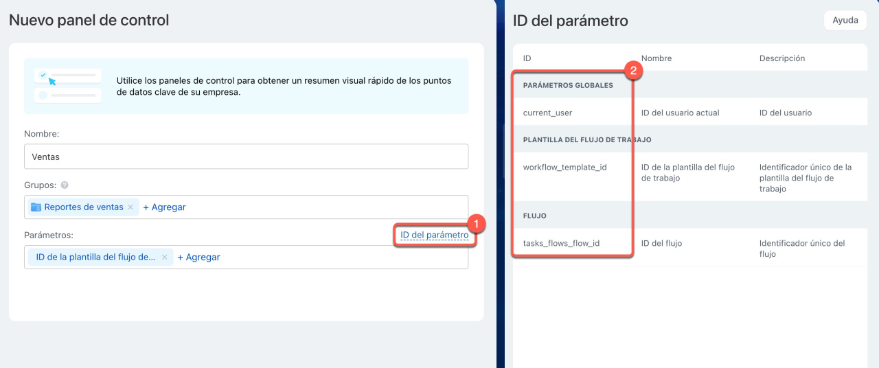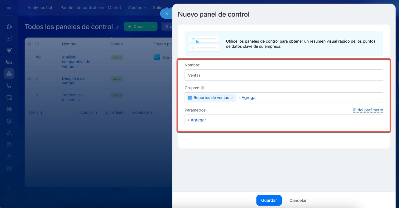 Al crear un panel de control, asígnale un nombre, agrégalo a los grupos donde se mostrará y define los parámetros necesarios. Los grupos determinan en qué sección se mostrará el informe y qué empleados pueden verlo.