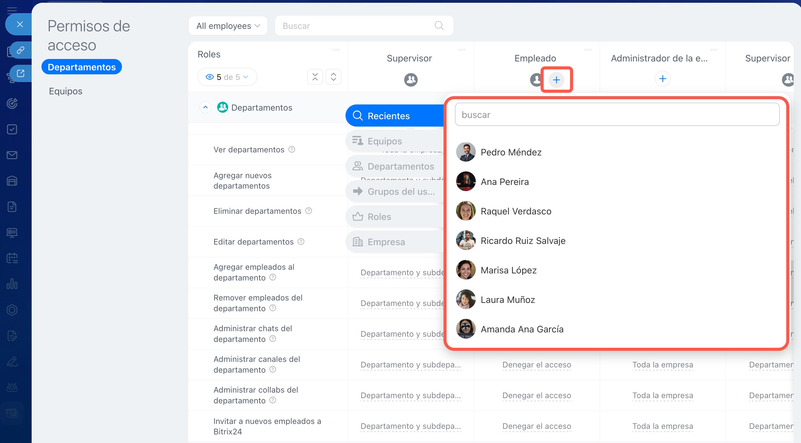 Haz clic en Plus (+) bajo el rol deseado y selecciona un empleado, departamento o grupo. Por ejemplo, un gerente podría necesitar permisos para añadir nuevos departamentos a la estructura, mientras que un supervisor suplente podría requerir permisos para editar la información de un departamento.