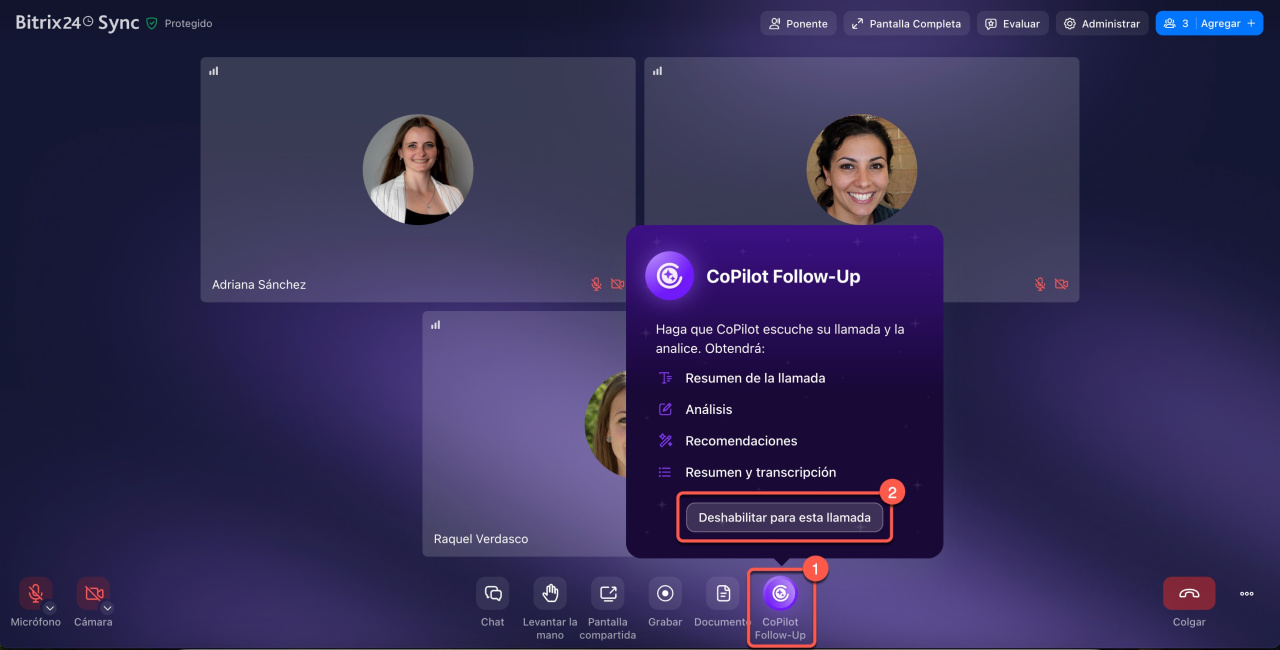 - CoPilot Follow-Up es el asistente de IA de Bitrix24 que analiza videollamadas y extrae automáticamente la información clave.