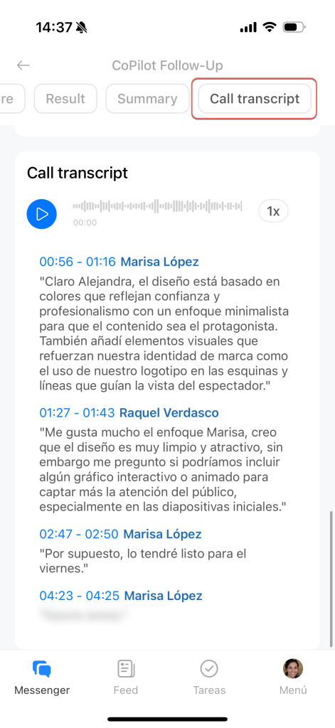 Transcripción de la llamada (Call transcript). Esta sección incluye el texto completo de la reunión, ideal para consultar declaraciones específicas o revisar detalles.