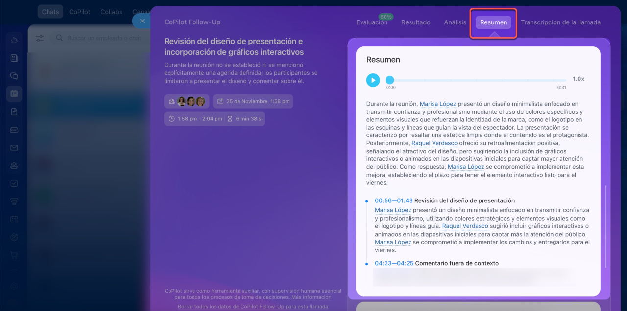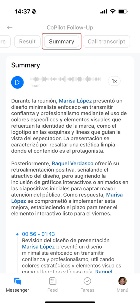 Resumen. CoPilot generará una síntesis organizada con marcas de tiempo, permitiendo localizar rápidamente los momentos clave cuando sea necesario.