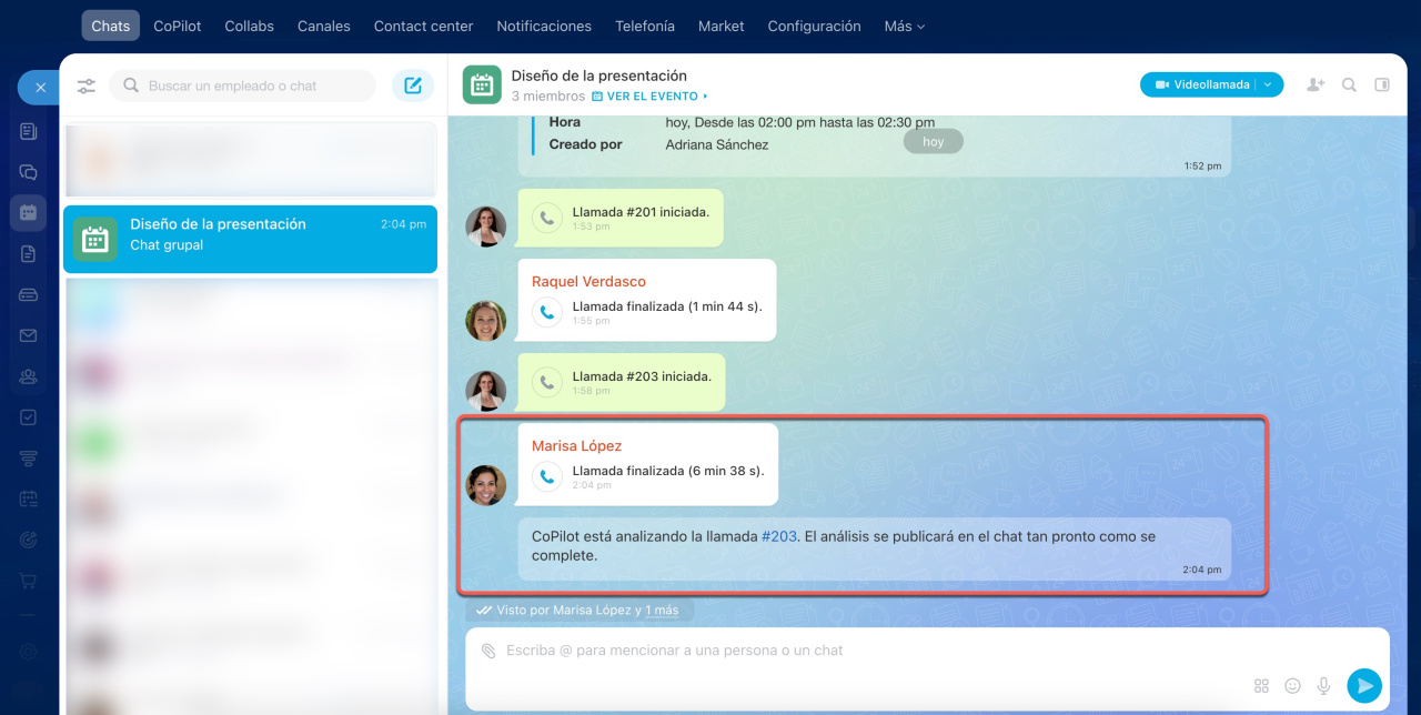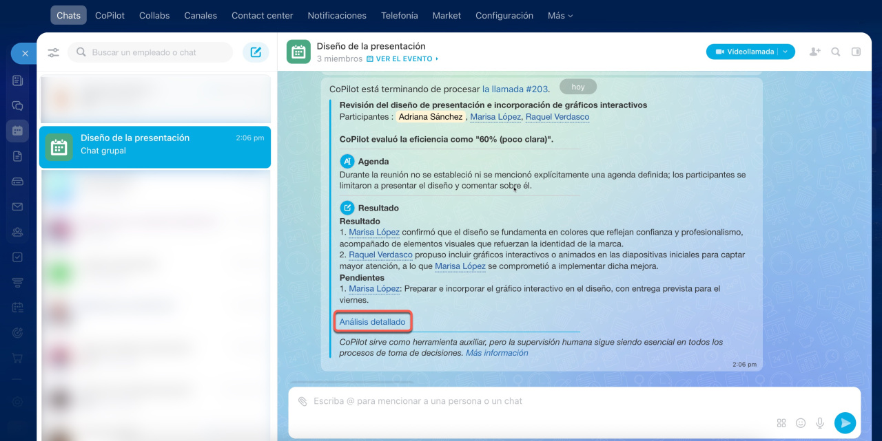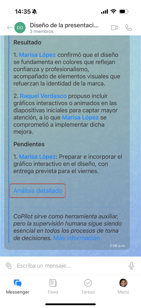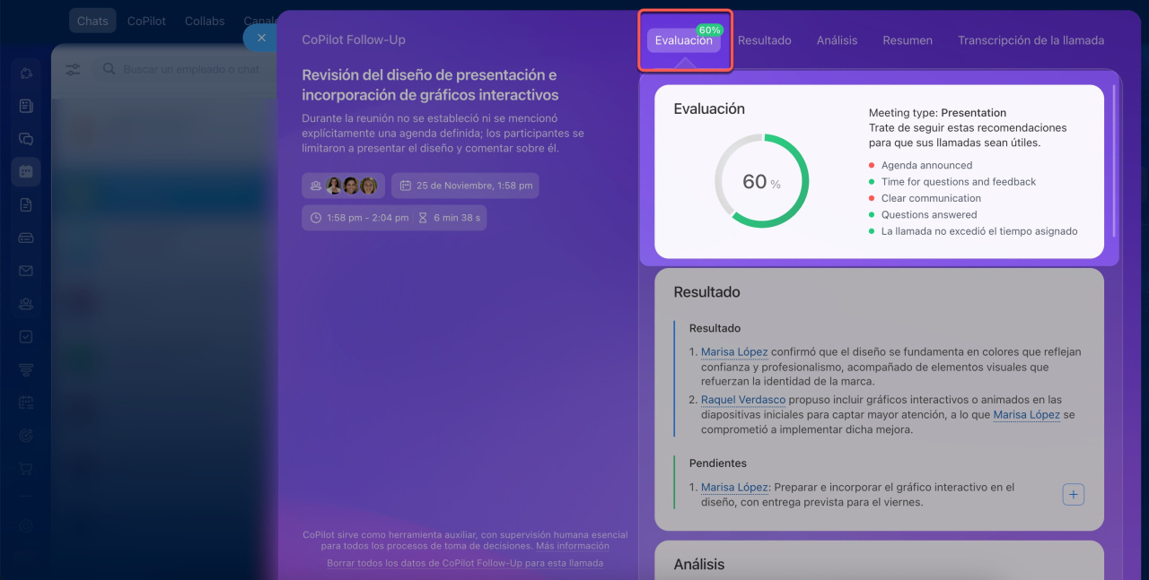 CoPilot envía el análisis al chat al terminar la videollamada. Puedes revisarlo allí o acceder al informe detallado de la reunión.