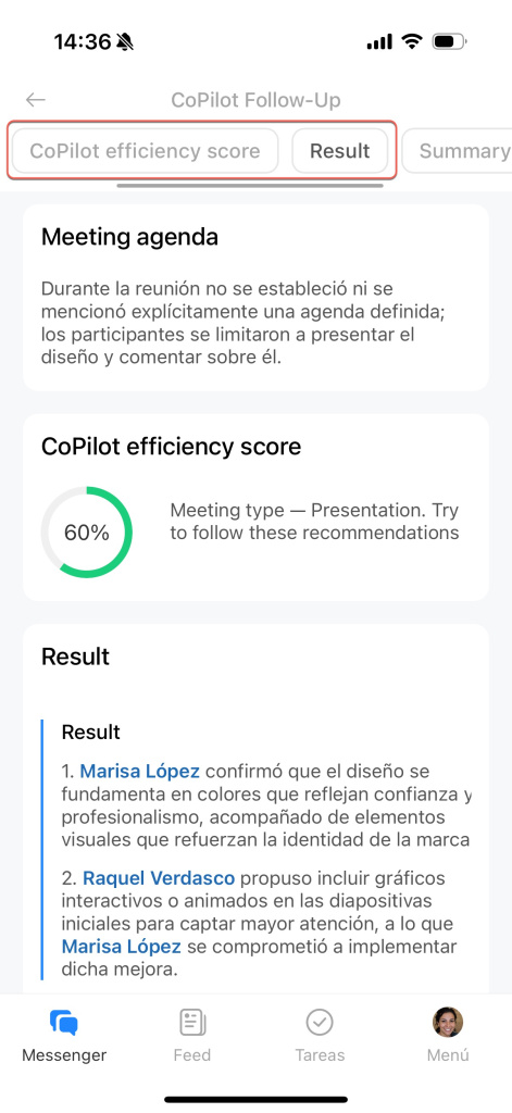 Resultado (Result). CoPilot sintetizará los principales acuerdos y conclusiones de la reunión. Además, registrará los compromisos acordados, permitiendo generar tareas o nuevas reuniones directamente desde ellos.