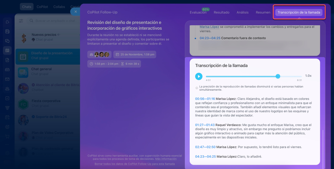 En las videollamadas de Bitrix24, ahora contamos con CoPilot Follow-Up, un asistente de IA que analiza la conversación, identifica los puntos clave y envía al chat: