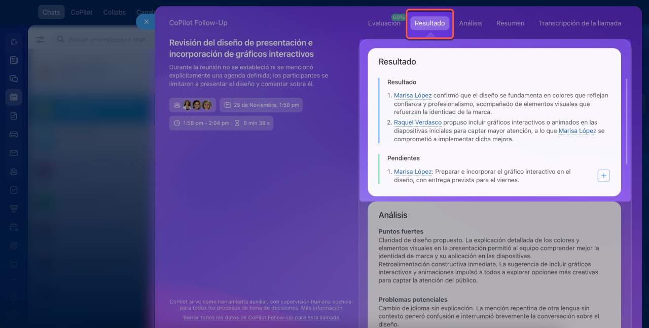 Una vez finalizada la llamada, CoPilot enviará el análisis de la reunión al chat. Para desactivarlo antes, selecciona CoPilot Follow-Up > Deshabilitar para esta llamada. Las activaciones múltiples generan un análisis consolidado.