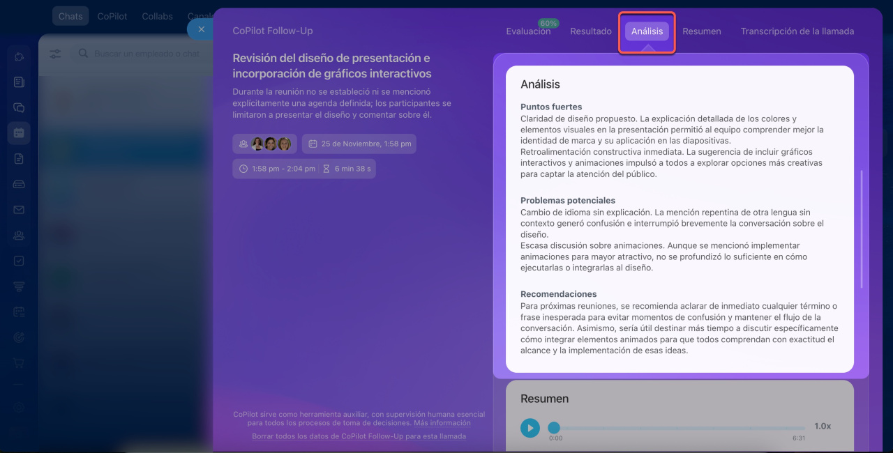Análisis. CoPilot analizará el desarrollo de la conversación, destacará los puntos fuertes y los problemas potenciales, y ofrecerá recomendaciones para mejorar la productividad y el desarrollo de ideas.