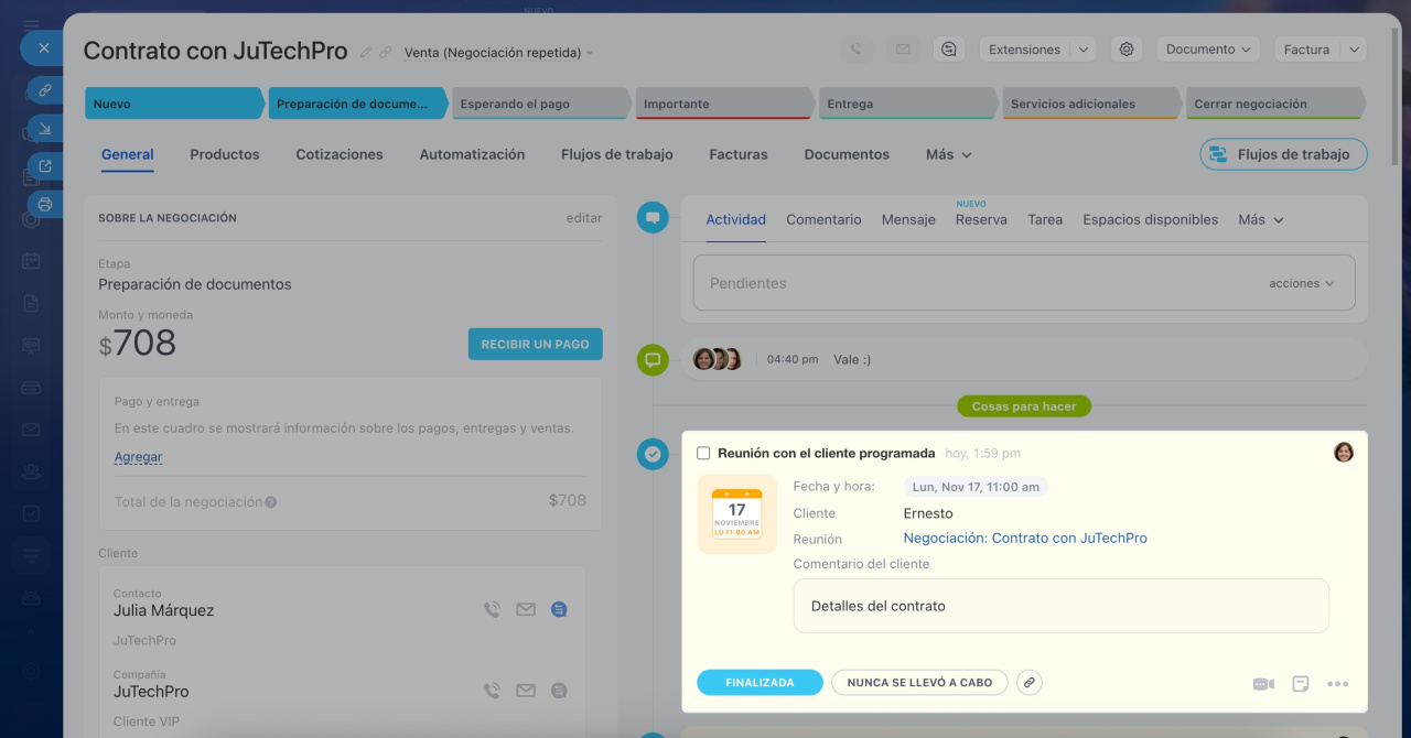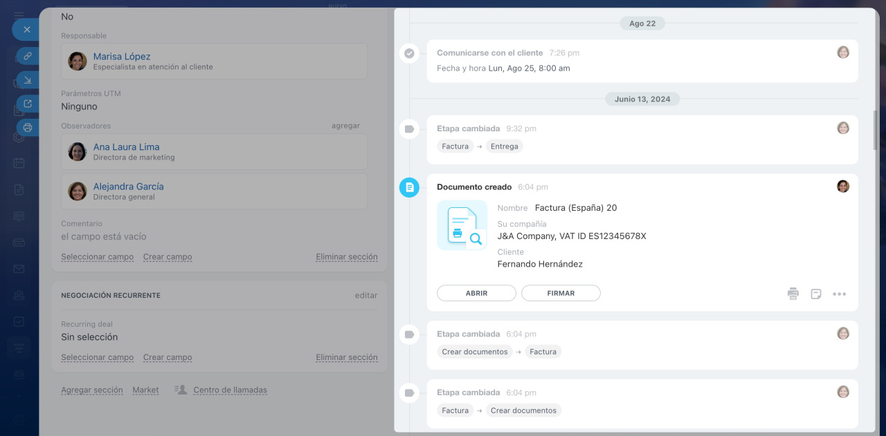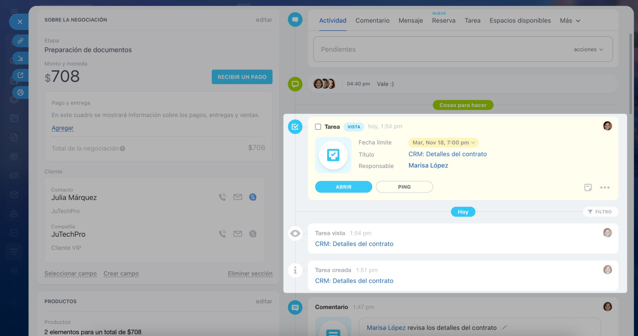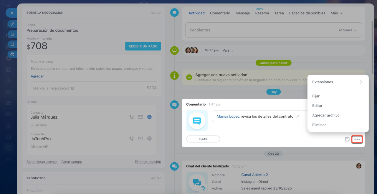 El timeline se encuentra en el lado derecho de la ficha de CRM. Aquí puedes planificar actividades, dejar comentarios para tus colegas y seguir los cambios de etapa. Además, guarda el historial de comunicación con el cliente.