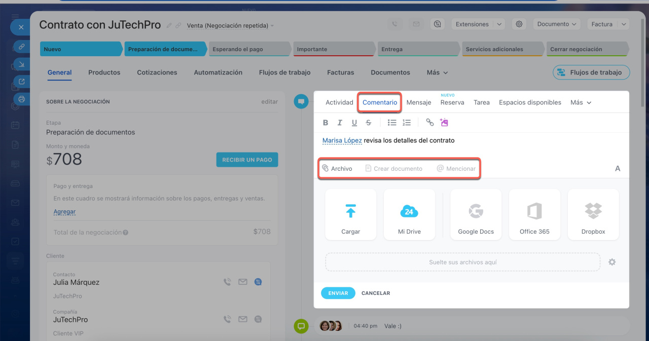 Añadir un archivo. Puedes subir un archivo desde tu computadora, Bitrix24 Drive o crear uno nuevo en la ficha, como un contrato o fotos.