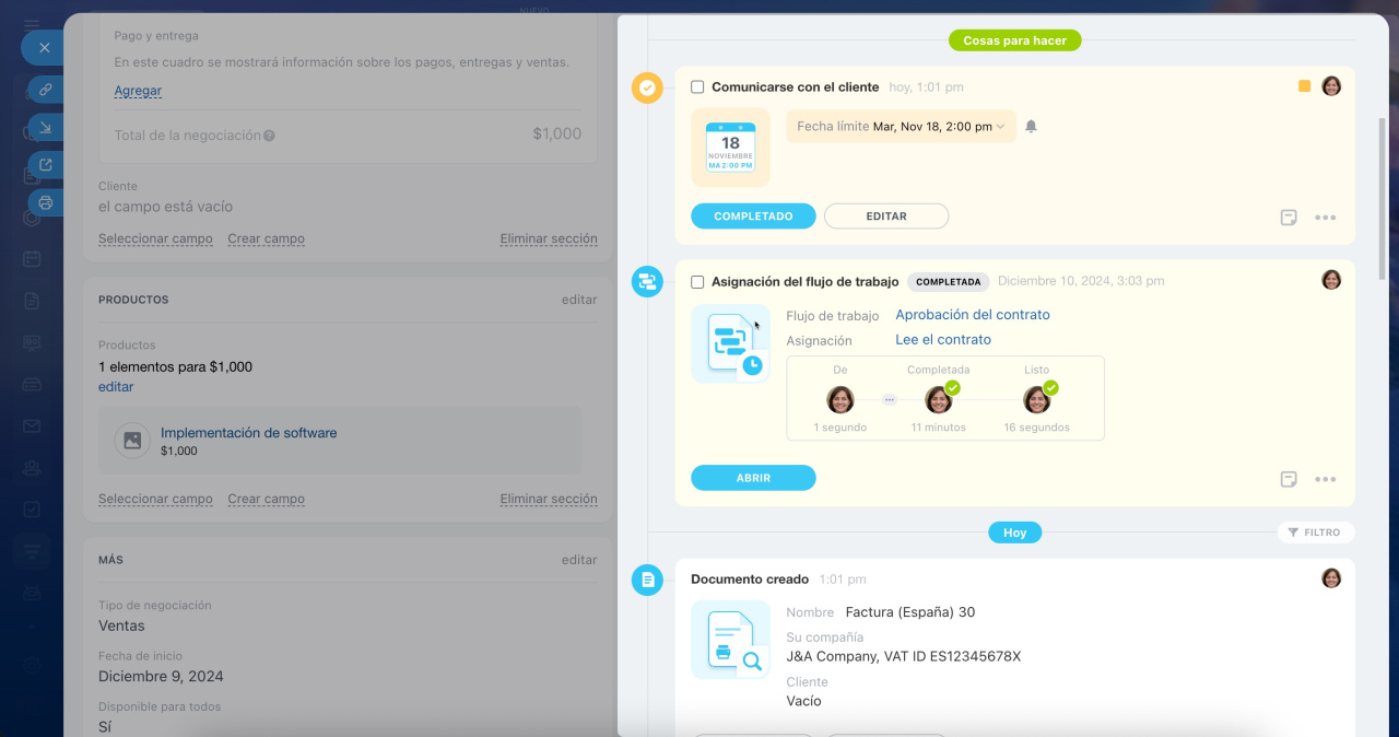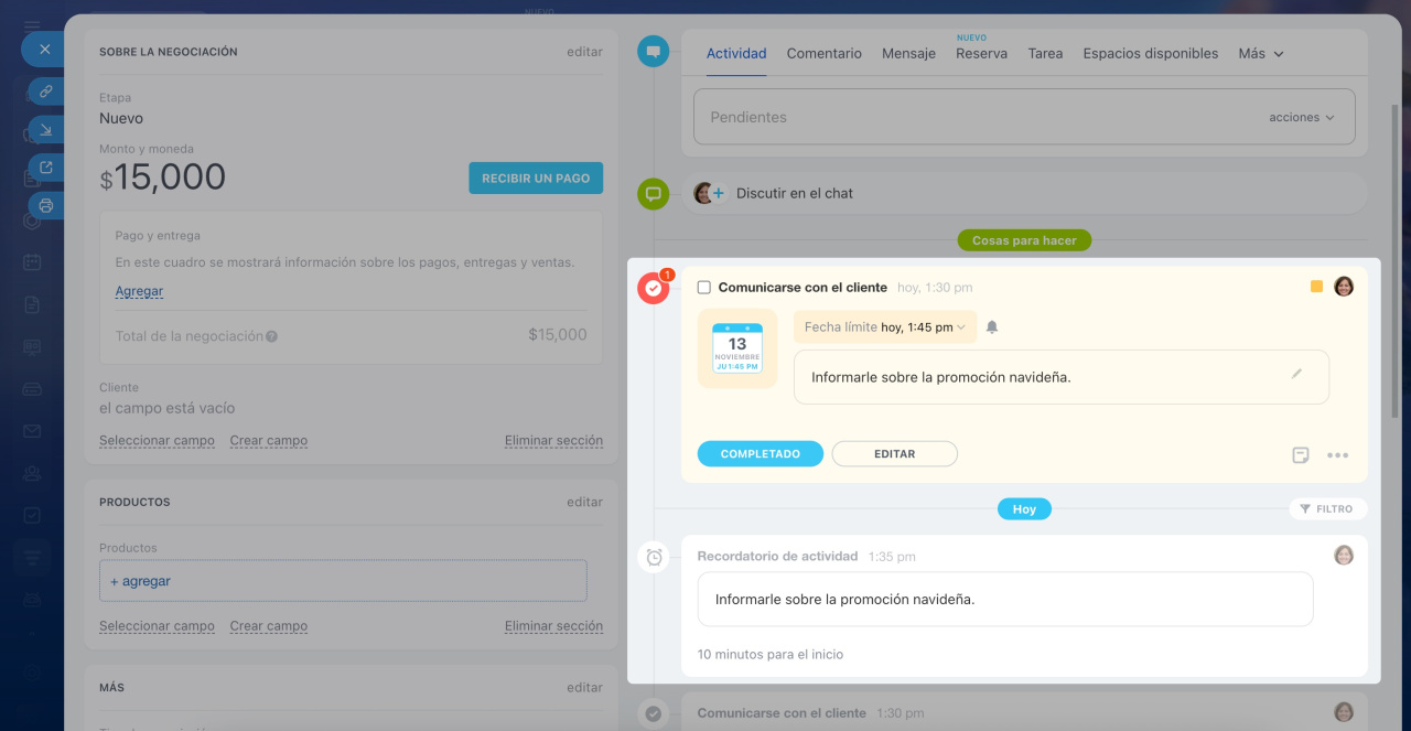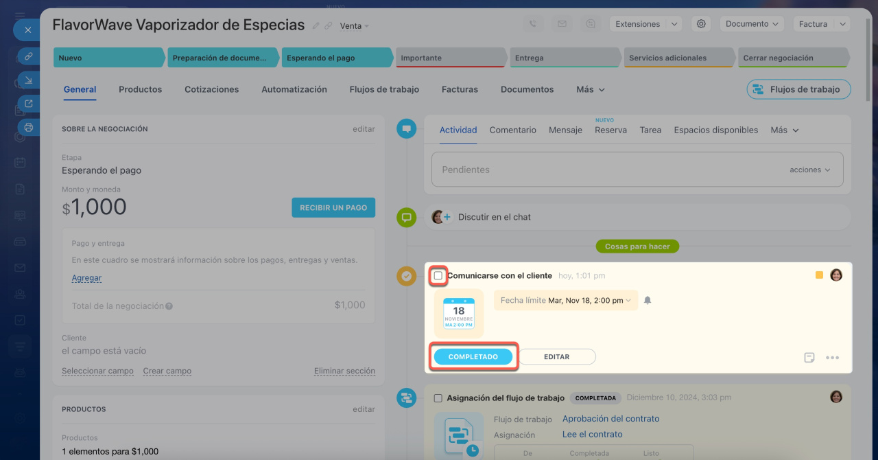 Completar una actividad. Después de contactar al cliente, puedes cerrar la actividad marcando la casilla junto a su nombre o presionando Completado. La información de la actividad completada aparecerá en el timeline.