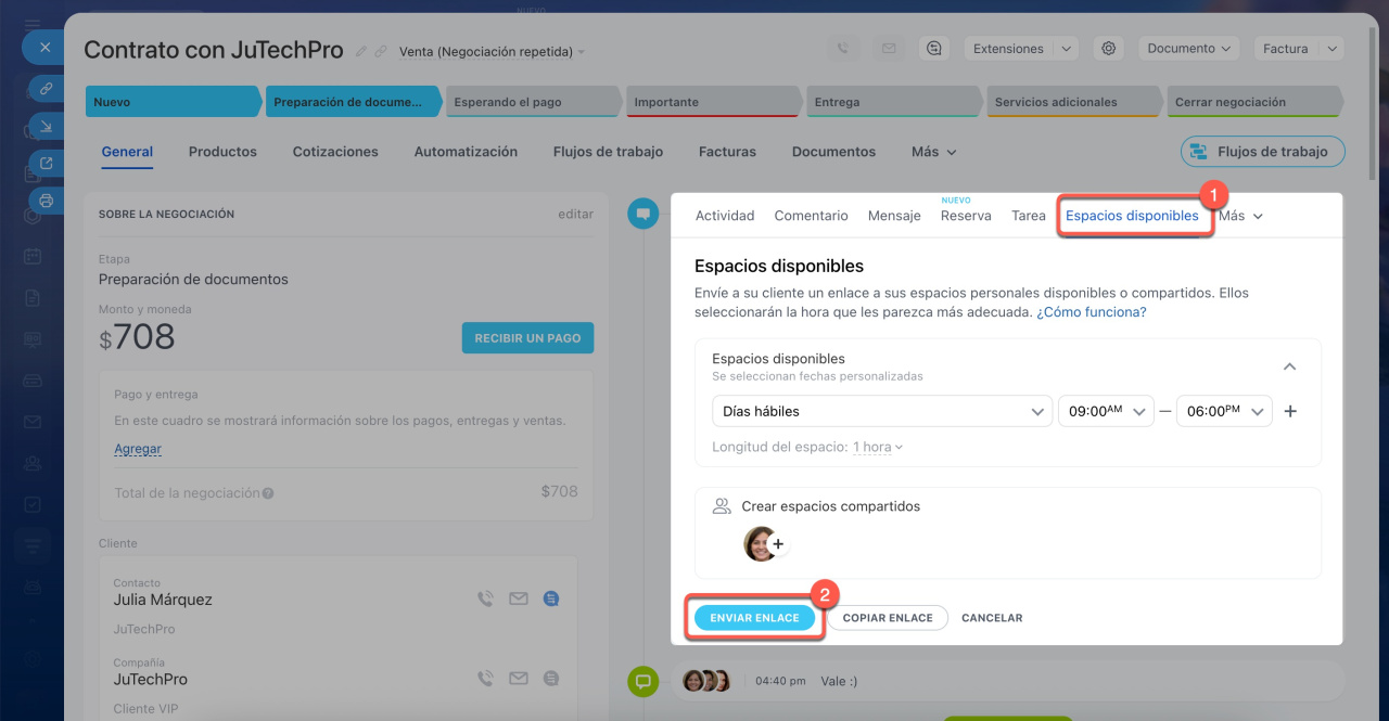 Haz clic en Espacios disponibles > Enviar enlace. Bitrix24 generará un enlace a tu calendario y lo enviará al cliente al número indicado. Una vez que el cliente elija la fecha y hora, el evento se añadirá automáticamente a la ficha de CRM y a tu calendario de Bitrix24.
