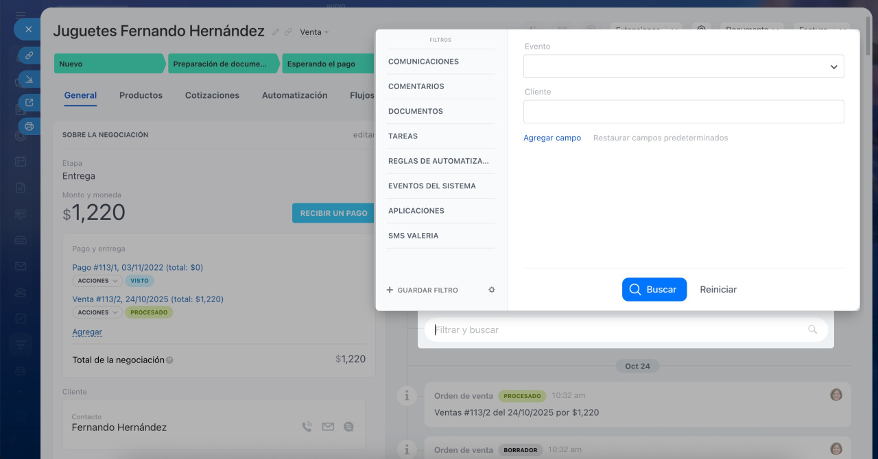 Usa el filtro para encontrar rápidamente la información que necesitas en el timeline. Puedes aplicar filtros estándar o crear los tuyos propios, buscando por tipo de evento, fecha de creación, autor o cliente.