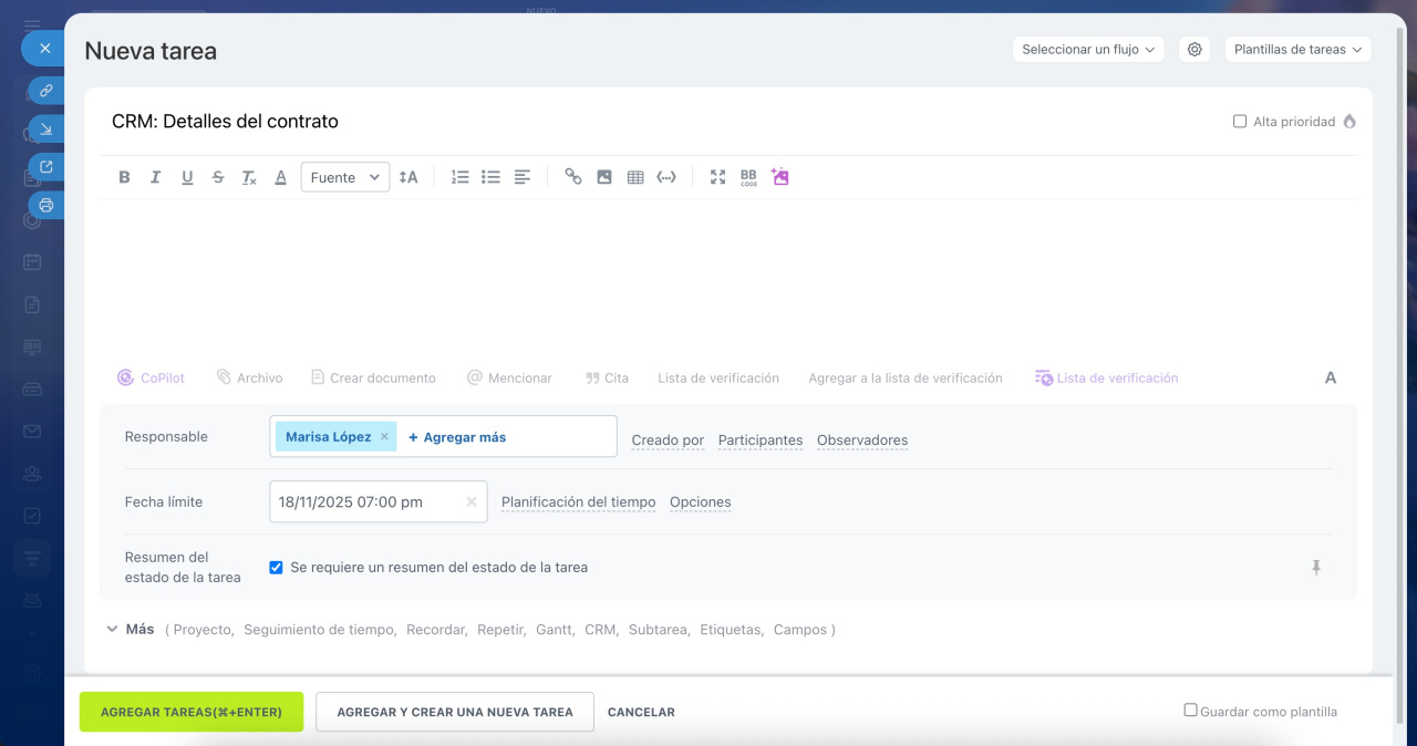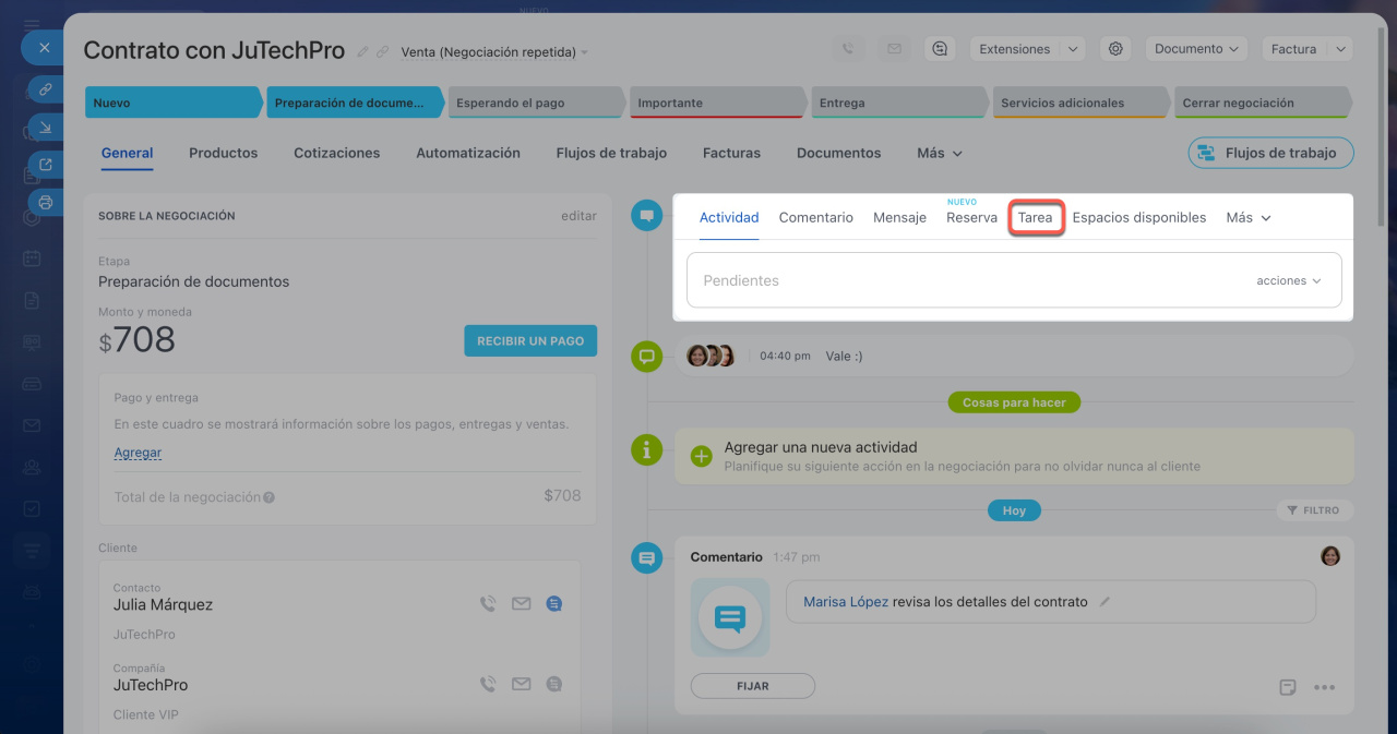 Puedes crear tareas relacionadas con el cliente directamente desde la ficha de CRM.