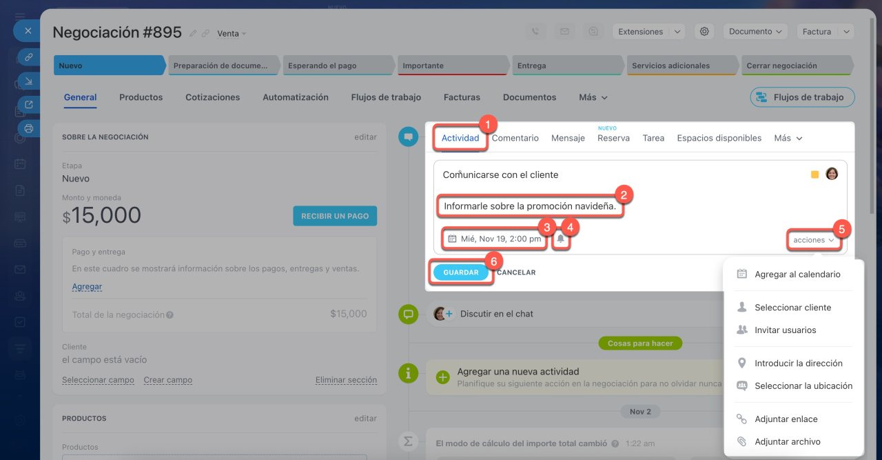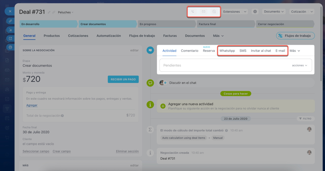 Desde la ficha de CRM, puedes llamar al cliente, enviarle un correo o SMS, e invitarlo a un mensajero. El historial de comunicación se guardará en el timeline.