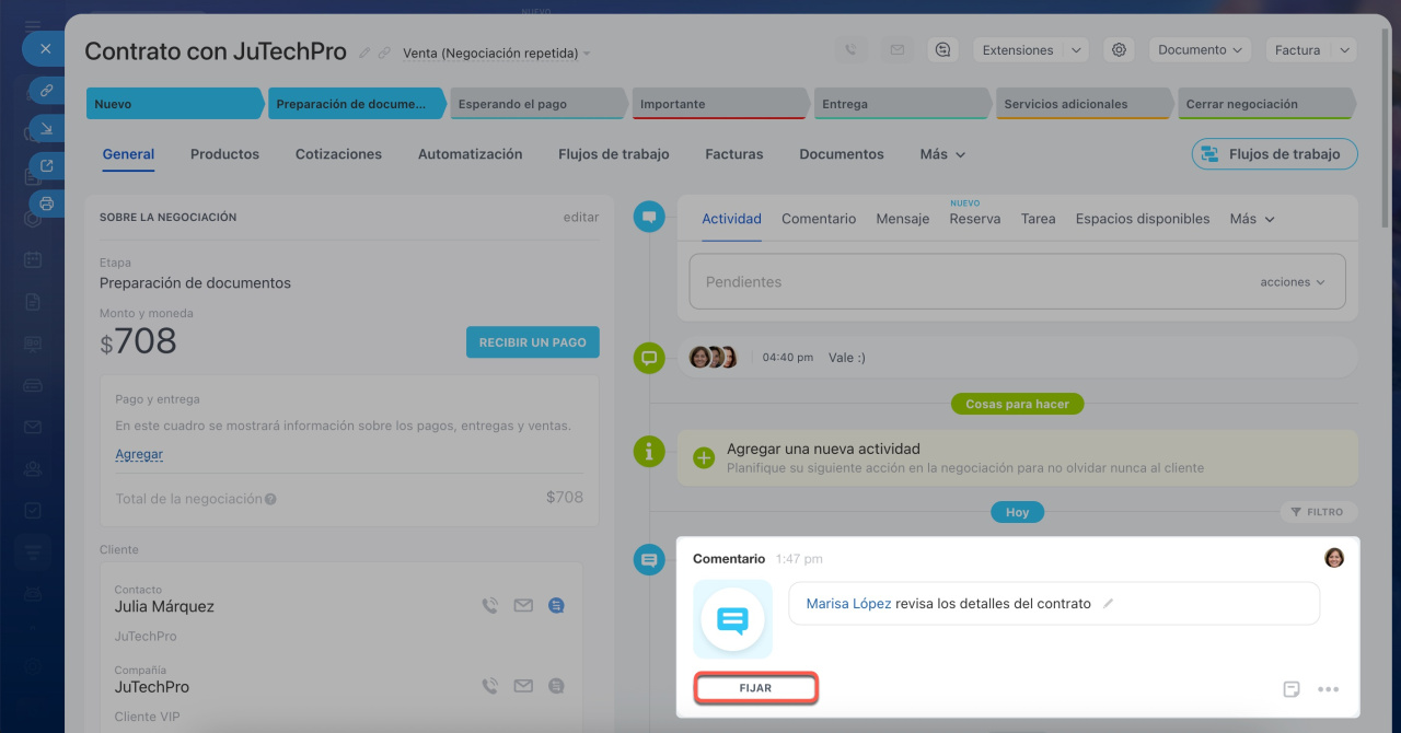 Fijar un comentario. Fija un comentario importante en la parte superior del timeline para que no se pierda. Ten en cuenta que solo puedes fijar hasta siete registros en el timeline.