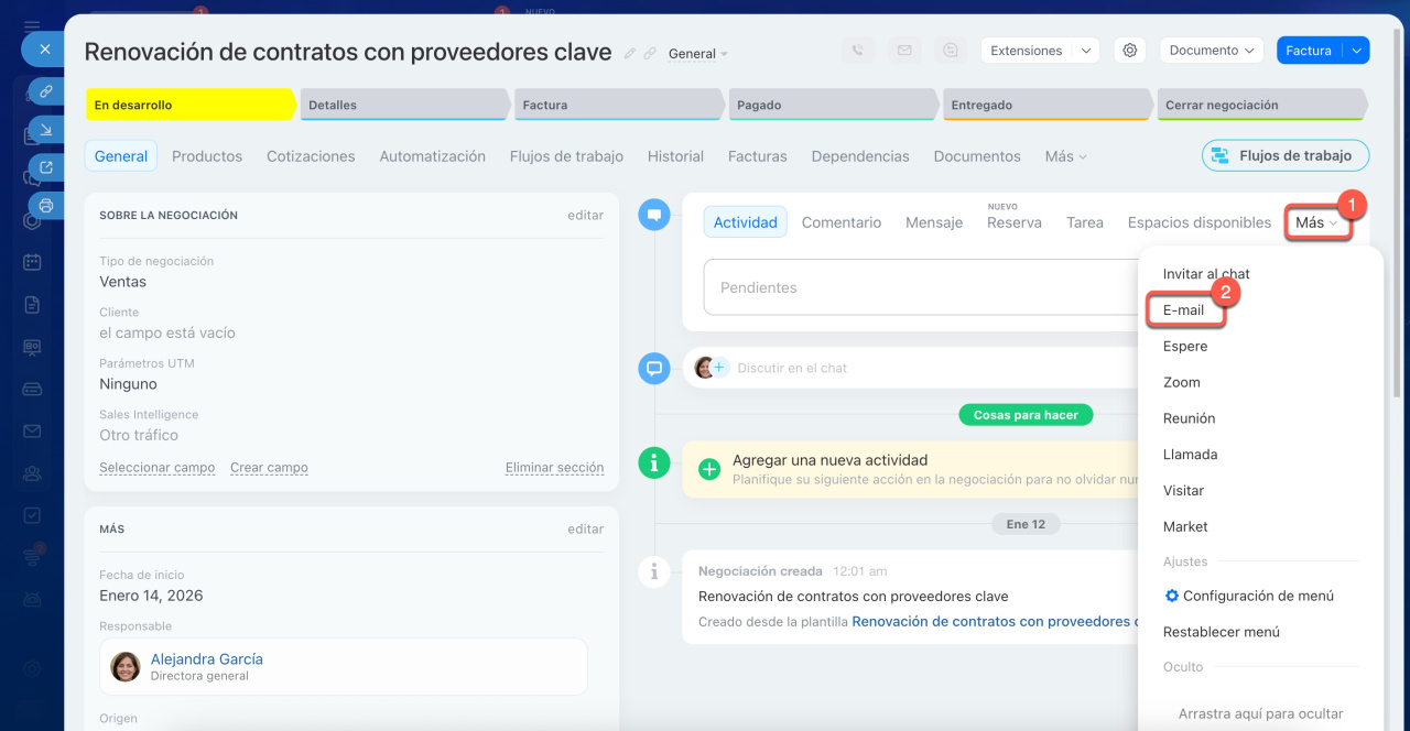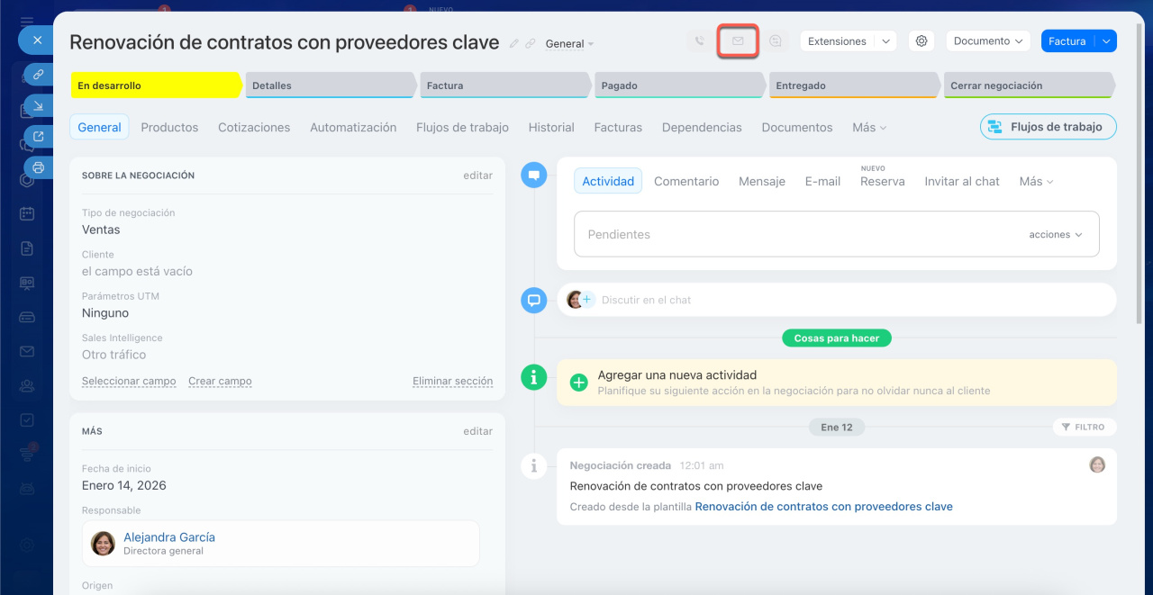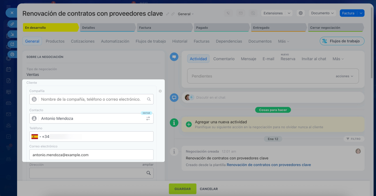 Una vez hecho esto, podrás enviar un correo desde la ficha de la negociación. Este nuevo contacto se añadirá al CRM, pero no se vinculará automáticamente a la negociación. Para vincularlo, solo tienes que seleccionarlo en el campo Cliente.