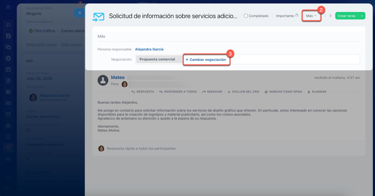 Si no ves el botón Cambiar negociación, no podrás vincular el correo a otra negociación. Esto sucede después de convertir un prospecto en negociación, ya que el correo queda vinculado a ambos.