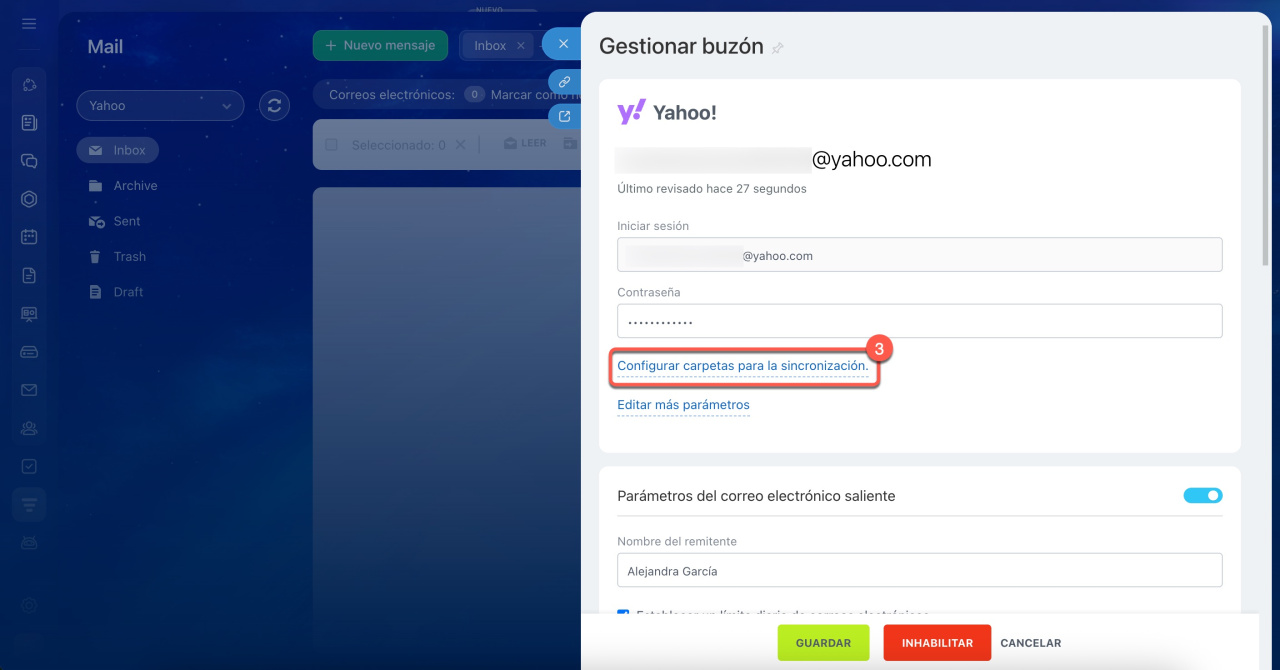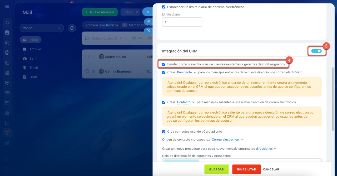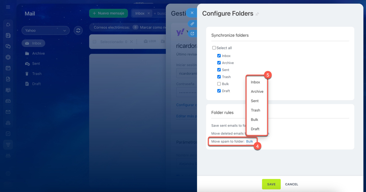 - Verifica el campo Mover spam a la carpeta (Move spam to folder). Si está seleccionada la bandeja de entrada, los correos no se guardarán automáticamente en el CRM.