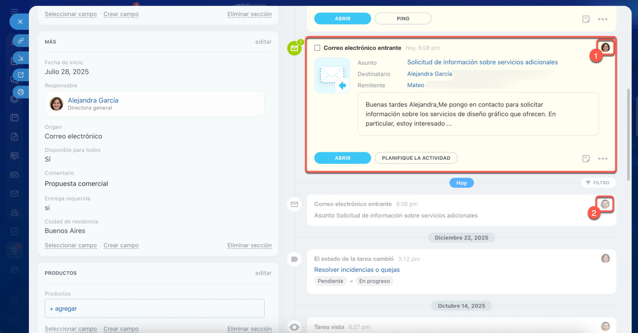 Al guardar un correo en el CRM, se añade una entrada en el timeline junto con la actividad programada. El avatar del empleado que conectó el buzón aparece junto a esta entrada, y él puede modificar la configuración de la integración del correo con el CRM (2).