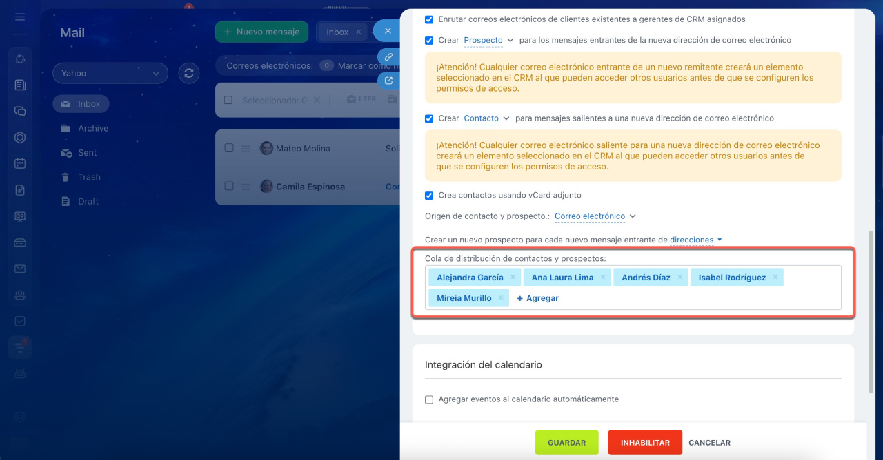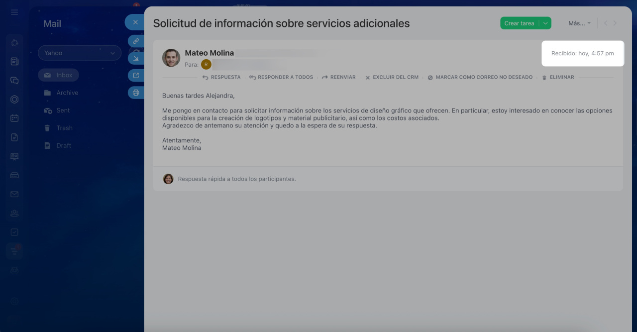 Si la integración con el CRM está activada en la configuración del buzón, los prospectos o negociaciones se crean automáticamente.